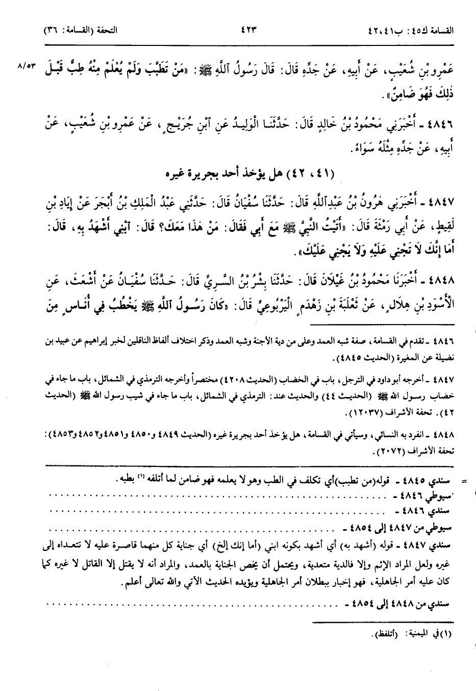 هَلْ يُؤْخَذُ أَحَدٌ بِجَرِيرَةِ غَيْرِهِ 4847 - أَخْبَرَنِي هَارُونُ بْنُ عَبْدِ اللَّهِ قَالَ حَدَّثَنَا سُفْيَانُ قَالَ حَدَّثَنِي عَبْدُ الْمَلِكِ بْنُ أَبْجَرَ عَنْ إِيَادِ بْنِ لَقِيطٍ عَنْ أَبِي رِمْثَةَ قَالَ أَتَيْتُ النَّبِيَّ صَلَّى اللَّهُ عَلَيْهِ وَسَلَّمَ مَعَ أَبِي فَقَالَ مَنْ هَذَا مَعَكَ قَالَ ابْنِي أَشْهَدُ بِهِ قَالَ أَمَا إِنَّكَ لَا تَجْنِي عَلَيْهِ وَلَا يَجْنِي عَلَيْكَ