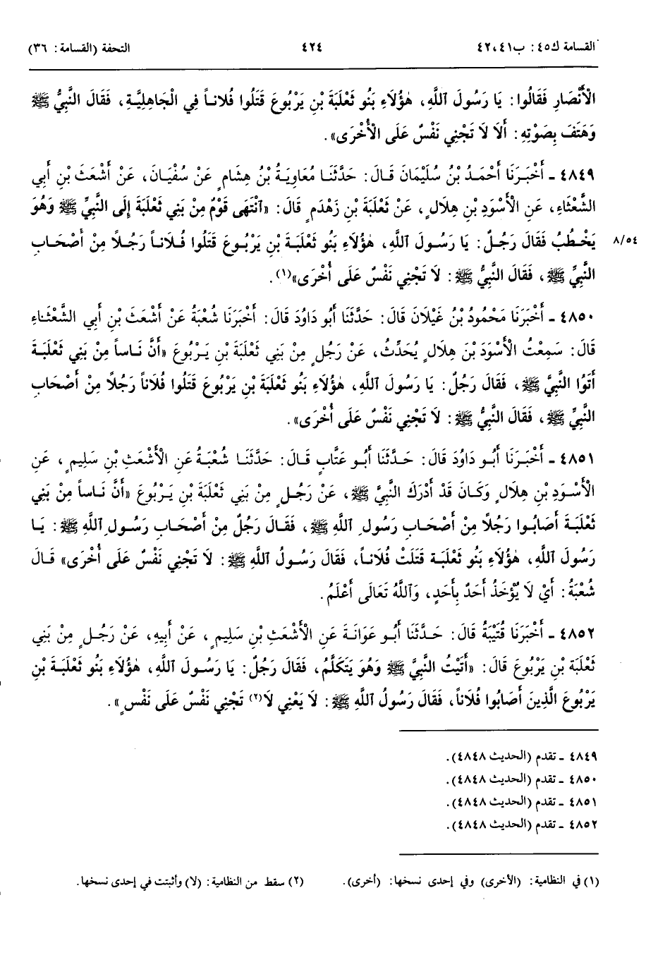 4851 - أَخْبَرَنَا أَبُو دَاوُدَ قَالَ حَدَّثَنَا أَبُو عَتَّابٍ قَالَ حَدَّثَنَا شُعْبَةُ عَنْ الْأَشْعَثِ بْنِ سُلَيْمٍ عَنْ الْأَسْوَدِ بْنِ هِلَالٍ وَكَانَ قَدْ أَدْرَكَ النَّبِيَّ صَلَّى اللَّهُ عَلَيْهِ وَسَلَّمَ عَنْ رَجُلٍ مِنْ بَنِي ثَعْلَبَةَ بْنِ يَرْبُوعٍ أَنَّ نَاسًا مِنْ بَنِي ثَعْلَبَةَ أَصَابُوا رَجُلًا مِنْ أَصْحَابِ النَّبِيِّ صَلَّى اللَّهُ عَلَيْهِ وَسَلَّمَ فَقَالَ رَجُلٌ مِنْ أَصْحَابِ رَسُولِ اللَّهِ صَلَّى اللَّهُ عَلَيْهِ وَسَلَّمَ يَا رَسُولَ اللَّهِ هَؤُلَاءِ بَنُو ثَعْلَبَةَ قَتَلَتْ فُلَانًا فَقَالَ رَسُولُ اللَّهِ صَلَّى اللَّهُ عَلَيْهِ وَسَلَّمَ لَا تَجْنِي نَفْسٌ عَلَى أُخْرَى قَالَ شُعْبَةُ أَيْ لَا يُؤْخَذُ أَحَدٌ بِأَحَدٍ وَاللَّهُ تَعَالَى أَعْلَمُ