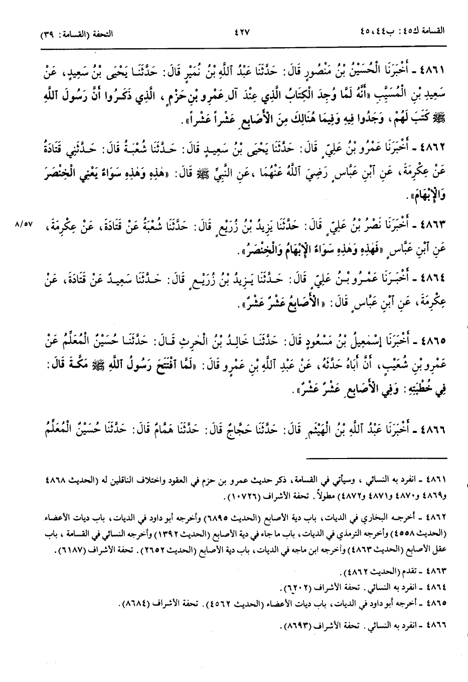 4861 - أَخْبَرَنَا الْحُسَيْنُ بْنُ مَنْصُورٍ قَالَ حَدَّثَنَا عَبْدُ اللَّهِ بْنُ نُمَيْرٍ قَالَ حَدَّثَنَا يَحْيَى بْنُ سَعِيدٍ عَنْ سَعِيدِ بْنِ الْمُسَيَّبِ أَنَّهُ لَمَّا وُجِدَ الْكِتَابُ الَّذِي عِنْدَ آلِ عَمْرِو بْنِ حَزْمٍ الَّذِي ذَكَرُوا أَنَّ رَسُولَ اللَّهِ صَلَّى اللَّهُ عَلَيْهِ وَسَلَّمَ كَتَبَ لَهُمْ وَجَدُوا فِيهِ وَفِيمَا هُنَالِكَ مِنْ الْأَصَابِعِ عَشْرًا عَشْرًا
