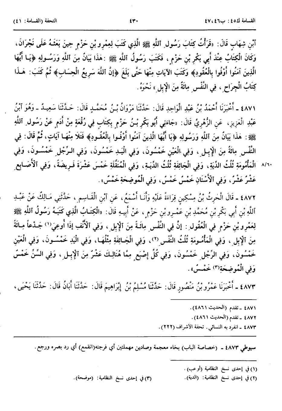 4872 - قَالَ الْحَارِثُ بْنُ مِسْكِينٍ قِرَاءَةً عَلَيْهِ وَأَنَا أَسْمَعُ عَنْ ابْنِ الْقَاسِمِ قَالَ حَدَّثَنِي مَالِكٌ عَنْ عَبْدِ اللَّهِ بْنِ أَبِي بَكْرِ بْنِ مُحَمَّدِ بْنِ عَمْرِو بْنِ حَزْمٍ عَنْ أَبِيهِ قَالَ الْكِتَابُ الَّذِي كَتَبَهُ رَسُولُ اللَّهِ صَلَّى اللَّهُ عَلَيْهِ وَسَلَّمَ لِعَمْرِو بْنِ حَزْمٍ فِي الْعُقُولِ إِنَّ فِي النَّفْسِ مِائَةً مِنْ الْإِبِلِ وَفِي الْأَنْفِ إِذَا أُوعِيَ جَدْعًا مِائَةً مِنْ الْإِبِلِ وَفِي الْمَأْمُومَةِ ثُلُثُ النَّفْسِ وَفِي الْجَائِفَةِ مِثْلُهَا وَفِي الْيَدِ خَمْسُونَ وَفِي الْعَيْنِ خَمْسُونَ وَفِي الرِّجْلِ خَمْسُونَ وَفِي كُلِّ إِصْبَعٍ مِمَّا هُنَالِكَ عَشْرٌ مِنْ الْإِبِلِ وَفِي السِّنِّ خَمْسٌ وَفِي الْمُوضِحَةِ خَمْسٌ