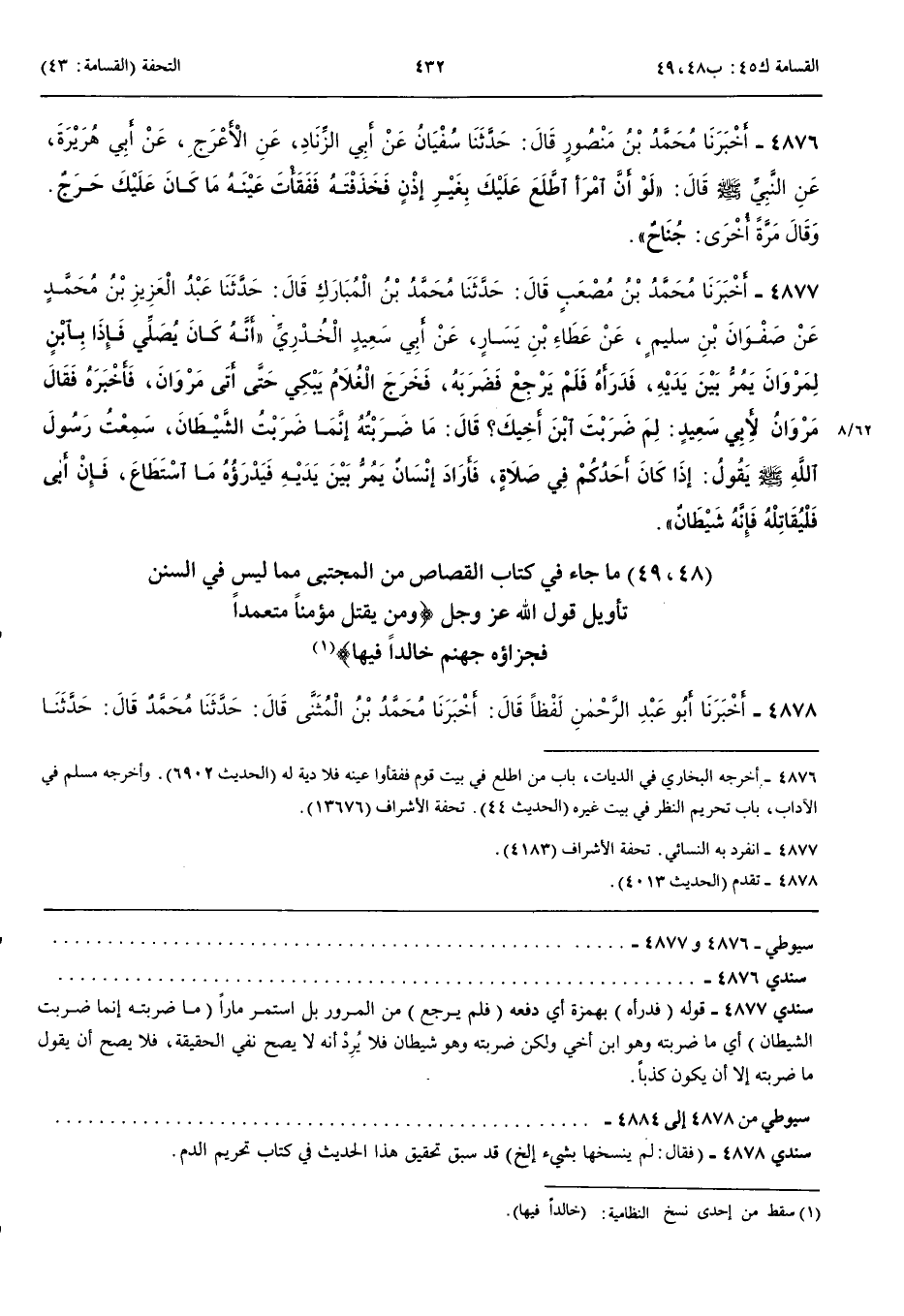 4876 - أَخْبَرَنَا مُحَمَّدُ بْنُ مَنْصُورٍ قَالَ حَدَّثَنَا سُفْيَانُ عَنْ أَبِي الزِّنَادِ عَنْ الْأَعْرَجِ عَنْ أَبِي هُرَيْرَةَ عَنْ النَّبِيِّ صَلَّى اللَّهُ عَلَيْهِ وَسَلَّمَ قَالَ لَوْ أَنَّ امْرَأً اطَّلَعَ عَلَيْكَ بِغَيْرِ إِذْنٍ فَخَذَفْتَهُ فَفَقَأْتَ عَيْنَهُ مَا كَانَ عَلَيْكَ حَرَجٌ وَقَالَ مَرَّةً أُخْرَى جُنَاحٌ
