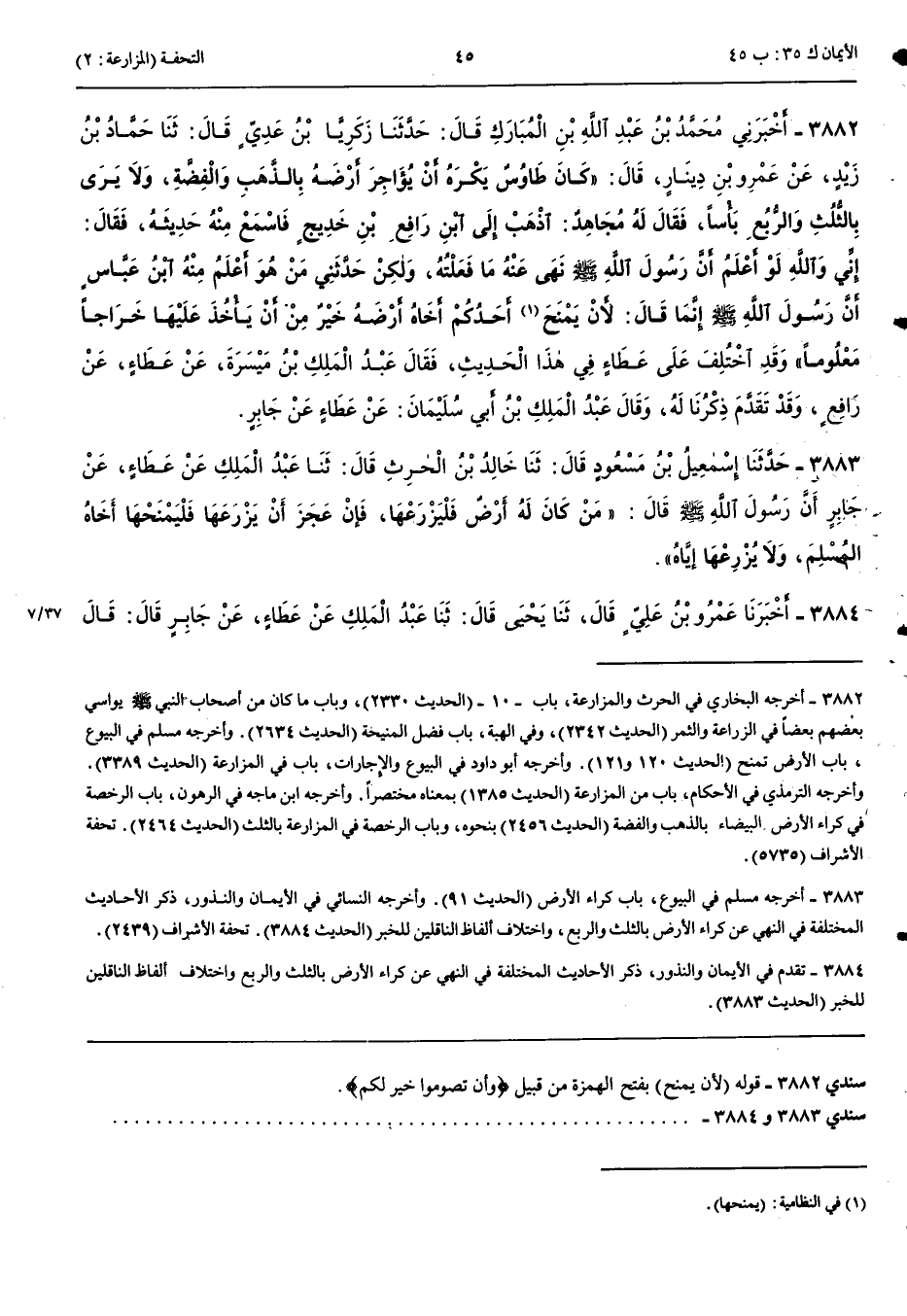3882 - أَخْبَرَنِي مُحَمَّدُ بْنُ عَبْدِ اللَّهِ بْنِ الْمُبَارَكِ قَالَ حَدَّثَنَا زَكَرِيَّا بْنُ عَدِيٍّ قَالَ حَدَّثَنَا حَمَّادُ بْنُ زَيْدٍ عَنْ عَمْرِو بْنِ دِينَارٍ قَالَ كَانَ طَاوُسٌ يَكْرَهُ أَنْ يُؤَاجِرَ أَرْضَهُ بِالذَّهَبِ وَالْفِضَّةِ وَلَا يَرَى بِالثُّلُثِ وَالرُّبُعِ بَأْسًا فَقَالَ لَهُ مُجَاهِدٌ اذْهَبْ إِلَى ابْنِ رَافِعِ بْنِ خَدِيجٍ فَاسْمَعْ مِنْهُ حَدِيثَهُ فَقَالَ إِنِّي وَاللَّهِ لَوْ أَعْلَمُ أَنَّ رَسُولَ اللَّهِ صَلَّى اللَّهُ عَلَيْهِ وَسَلَّمَ نَهَى عَنْهُ مَا فَعَلْتُهُ وَلَكِنْ حَدَّثَنِي مَنْ هُوَ أَعْلَمُ مِنْهُ ابْنُ عَبَّاسٍ أَنَّ رَسُولَ اللَّهِ صَلَّى اللَّهُ عَلَيْهِ وَسَلَّمَ إِنَّمَا قَالَ لَأَنْ يَمْنَحَ أَحَدُكُمْ أَخَاهُ أَرْضَهُ خَيْرٌ مِنْ أَنْ يَأْخُذَ عَلَيْهَا خَرَاجًا مَعْلُومًا وَقَدْ اخْتُلِفَ عَلَى عَطَاءٍ فِي هَذَا الْحَدِيثِ فَقَالَ عَبْدُ الْمَلِكِ بْنُ مَيْسَرَةَ عَنْ عَطَاءٍ عَنْ رَافِعٍ وَقَدْ تَقَدَّمَ ذِكْرُنَا لَهُ وَقَالَ عَبْدُ الْمَلِكِ بْنُ أَبِي سُلَيْمَانَ عَنْ عَطَاءٍ عَنْ جَابِرٍ