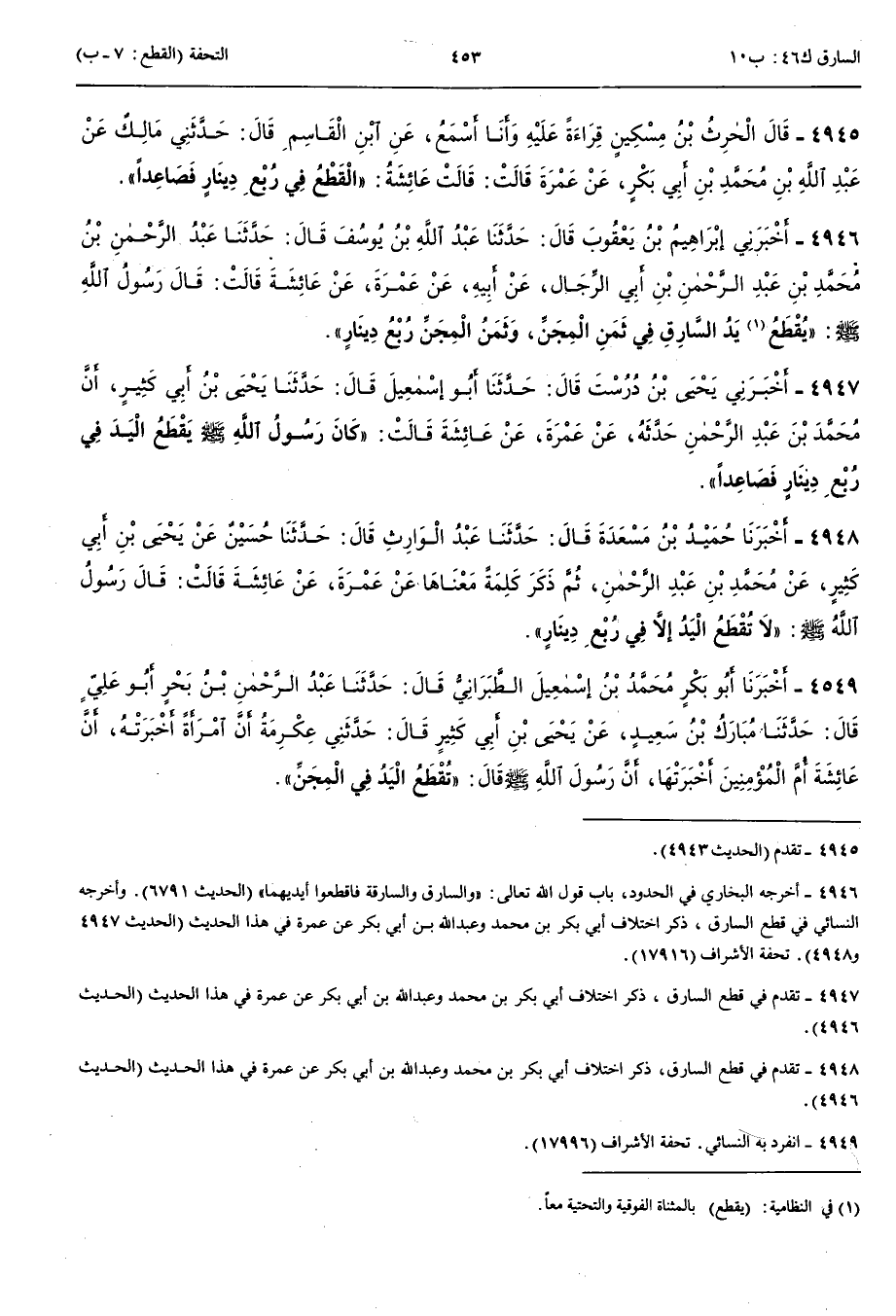 4945 - قَالَ الْحَارِثُ بْنُ مِسْكِينٍ قِرَاءَةً عَلَيْهِ وَأَنَا أَسْمَعُ عَنْ ابْنِ الْقَاسِمِ قَالَ حَدَّثَنِي مَالِكٌ عَنْ عَبْدِ اللَّهِ بْنِ مُحَمَّدِ بْنِ أَبِي بَكْرٍ عَنْ عَمْرَةَ قَالَتْ قَالَتْ عَائِشَةُ الْقَطْعُ فِي رُبْعِ دِينَارٍ فَصَاعِدًا