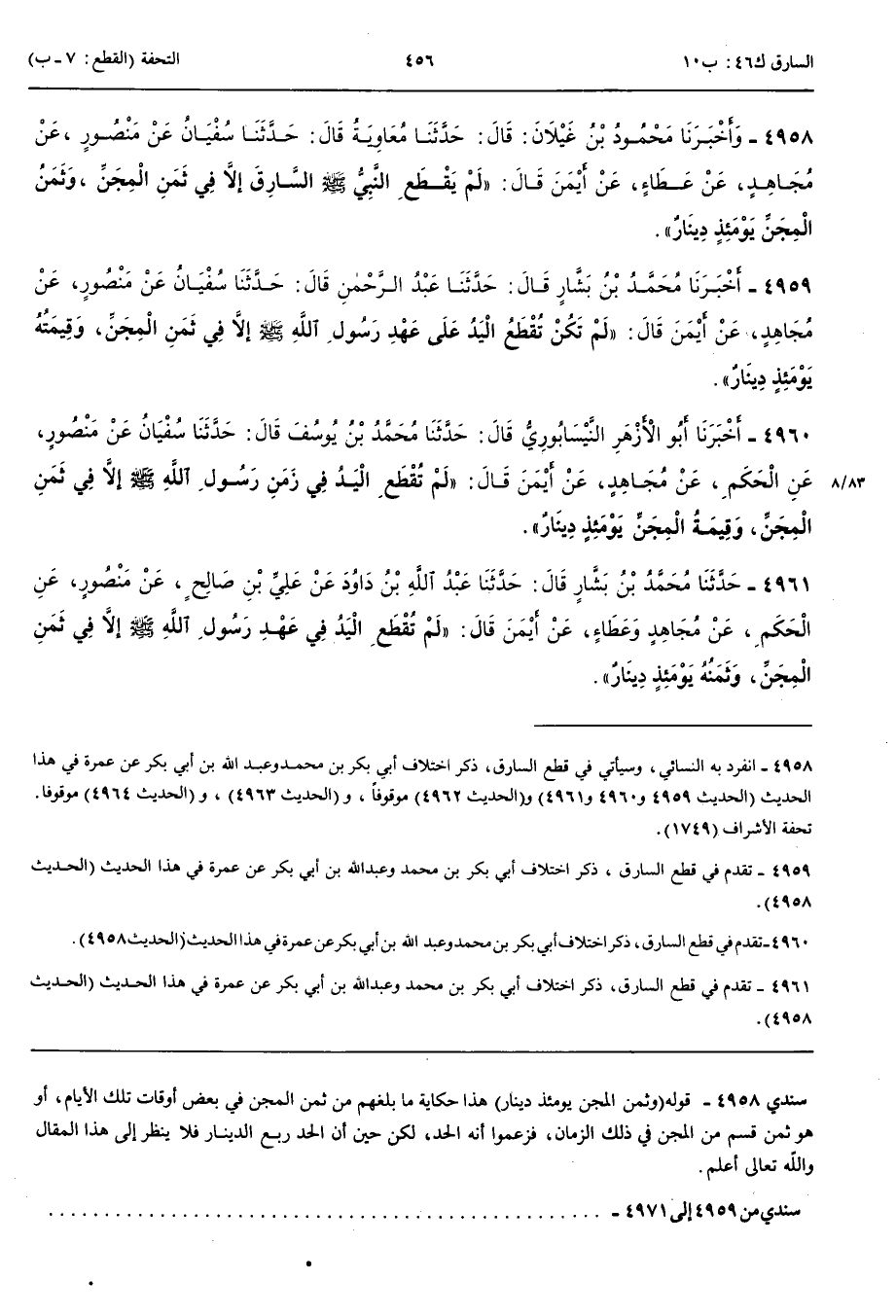4959 - أَخْبَرَنَا مُحَمَّدُ بْنُ بَشَّارٍ قَالَ حَدَّثَنَا عَبْدُ الرَّحْمَنِ قَالَ حَدَّثَنَا سُفْيَانُ عَنْ مَنْصُورٍ عَنْ مُجَاهِدٍ عَنْ أَيْمَنَ قَالَ لَمْ تَكُنْ تُقْطَعُ الْيَدُ عَلَى عَهْدِ رَسُولِ اللَّهِ صَلَّى اللَّهُ عَلَيْهِ وَسَلَّمَ إِلَّا فِي ثَمَنِ الْمِجَنِّ وَقِيمَتُهُ يَوْمَئِذٍ دِينَارٌ