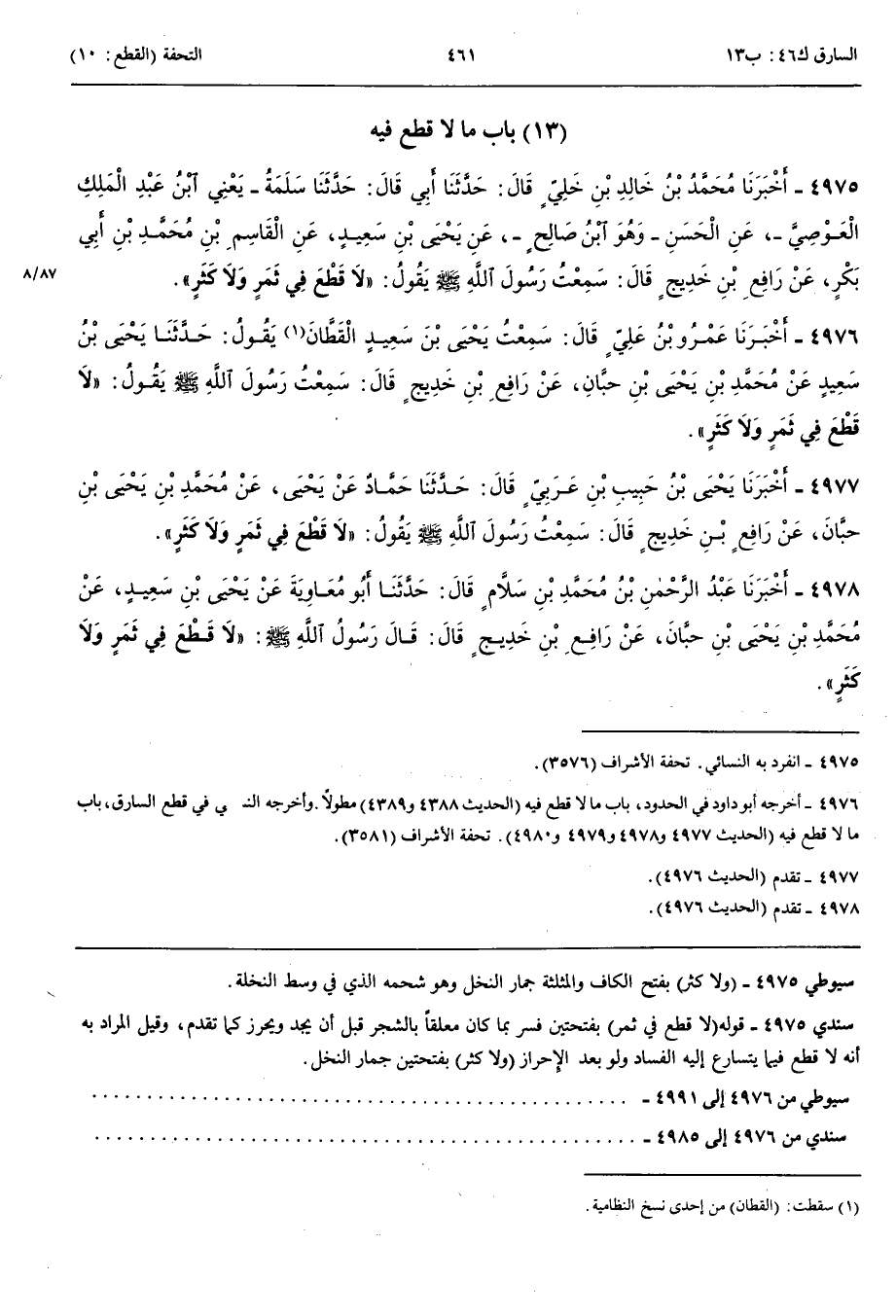 4977 - أَخْبَرَنِي يَحْيَى بْنُ حَبِيبِ بْنِ عَرَبِيٍّ قَالَ حَدَّثَنَا حَمَّادٌ عَنْ يَحْيَى عَنْ مُحَمَّدِ بْنِ يَحْيَى بْنِ حَبَّانَ عَنْ رَافِعِ بْنِ خَدِيجٍ قَالَ سَمِعْتُ رَسُولَ اللَّهِ صَلَّى اللَّهُ عَلَيْهِ وَسَلَّمَ يَقُولُ لَا قَطْعَ فِي ثَمَرٍ وَلَا كَثَرٍ