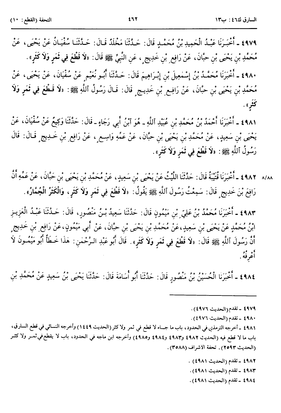 4979 - أَخْبَرَنَا عَبْدُ الْحَمِيدِ بْنُ مُحَمَّدٍ قَالَ حَدَّثَنَا مَخْلَدٌ قَالَ حَدَّثَنَا سُفْيَانُ عَنْ يَحْيَى عَنْ مُحَمَّدِ بْنِ يَحْيَى بْنِ حَبَّانَ عَنْ رَافِعِ بْنِ خَدِيجٍ عَنْ النَّبِيِّ صَلَّى اللَّهُ عَلَيْهِ وَسَلَّمَ قَالَ لَا قَطْعَ فِي ثَمَرٍ وَلَا كَثَرٍ