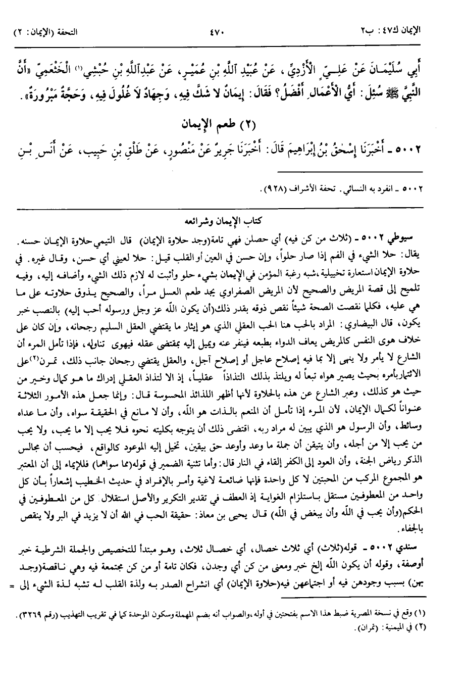 طَعْمُ الْإِيمَانِ 5002 - أَخْبَرَنَا إِسْحَقُ بْنُ إِبْرَاهِيمَ قَالَ أَنْبَأَنَا جَرِيرٌ عَنْ مَنْصُورٍ عَنْ طَلْقِ بْنِ حَبِيبٍ عَنْ أَنَسِ بْنِ مَالِكٍ قَالَ قَالَ رَسُولُ اللَّهِ صَلَّى اللَّهُ عَلَيْهِ وَسَلَّمَ ثَلَاثٌ مَنْ كُنَّ فِيهِ وَجَدَ بِهِنَّ حَلَاوَةَ الْإِيمَانِ وَطَعْمَهُ أَنْ يَكُونَ اللَّهُ عَزَّ وَجَلَّ وَرَسُولُهُ أَحَبَّ إِلَيْهِ مِمَّا سِوَاهُمَا وَأَنْ يُحِبَّ فِي اللَّهِ وَأَنْ يَبْغُضَ فِي اللَّهِ وَأَنْ تُوقَدَ نَارٌ عَظِيمَةٌ فَيَقَعَ فِيهَا أَحَبَّ إِلَيْهِ مِنْ أَنْ يُشْرِكَ بِاللَّهِ شَيْئًا