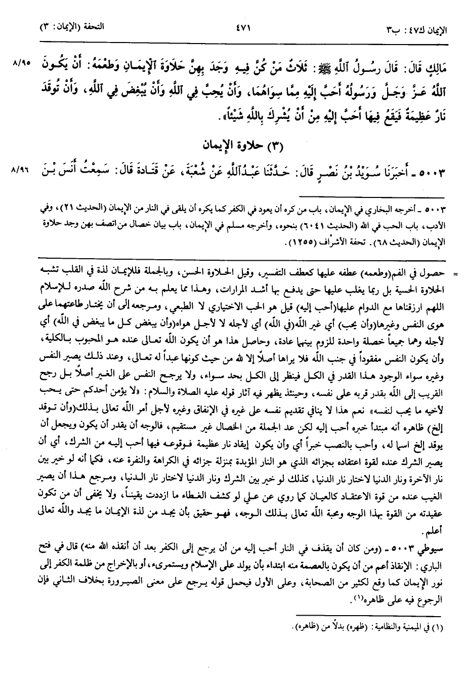 حَلَاوَةُ الْإِيمَانِ 5003 - أَخْبَرَنَا سُوَيْدُ بْنُ نَصْرٍ قَالَ حَدَّثَنَا عَبْدُ اللَّهِ عَنْ شُعْبَةَ عَنْ قَتَادَةَ قَالَ سَمِعْتُ أَنَسَ بْنَ مَالِكٍ رَضِيَ اللَّهُ عَنْهُ يُحَدِّثُ عَنْ النَّبِيِّ صَلَّى اللَّهُ عَلَيْهِ وَسَلَّمَ قَالَ ثَلَاثٌ مَنْ كُنَّ فِيهِ وَجَدَ حَلَاوَةَ الْإِيمَانِ مَنْ أَحَبَّ الْمَرْءَ لَا يُحِبُّهُ إِلَّا لِلَّهِ عَزَّ وَجَلَّ وَمَنْ كَانَ اللَّهُ عَزَّ وَجَلَّ وَرَسُولُهُ أَحَبَّ إِلَيْهِ مِمَّا سِوَاهُمَا وَمَنْ كَانَ أَنْ يُقْذَفَ فِي النَّارِ أَحَبَّ إِلَيْهِ مِنْ أَنْ يَرْجِعَ إِلَى الْكُفْرِ بَعْدَ أَنْ أَنْقَذَهُ اللَّهُ مِنْهُ