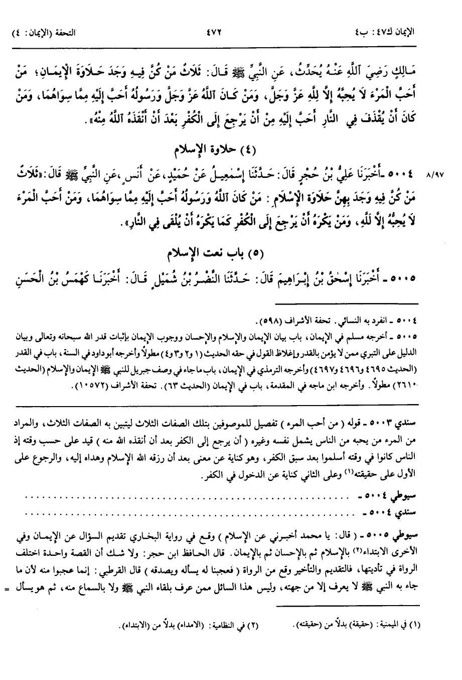 حَلَاوَةُ الْإِسْلَامِ 5004 - أَخْبَرَنَا عَلِيُّ بْنُ حُجْرٍ قَالَ حَدَّثَنَا إِسْمَعِيلُ عَنْ حُمَيْدٍ عَنْ أَنَسٍ عَنْ النَّبِيِّ صَلَّى اللَّهُ عَلَيْهِ وَسَلَّمَ قَالَ ثَلَاثٌ مَنْ كُنَّ فِيهِ وَجَدَ بِهِنَّ حَلَاوَةَ الْإِسْلَامِ مَنْ كَانَ اللَّهُ وَرَسُولُهُ أَحَبَّ إِلَيْهِ مِمَّا سِوَاهُمَا وَمَنْ أَحَبَّ الْمَرْءَ لَا يُحِبُّهُ إِلَّا لِلَّهِ وَمَنْ يَكْرَهُ أَنْ يَرْجِعَ إِلَى الْكُفْرِ كَمَا يَكْرَهُ أَنْ يُلْقَى فِي النَّارِ