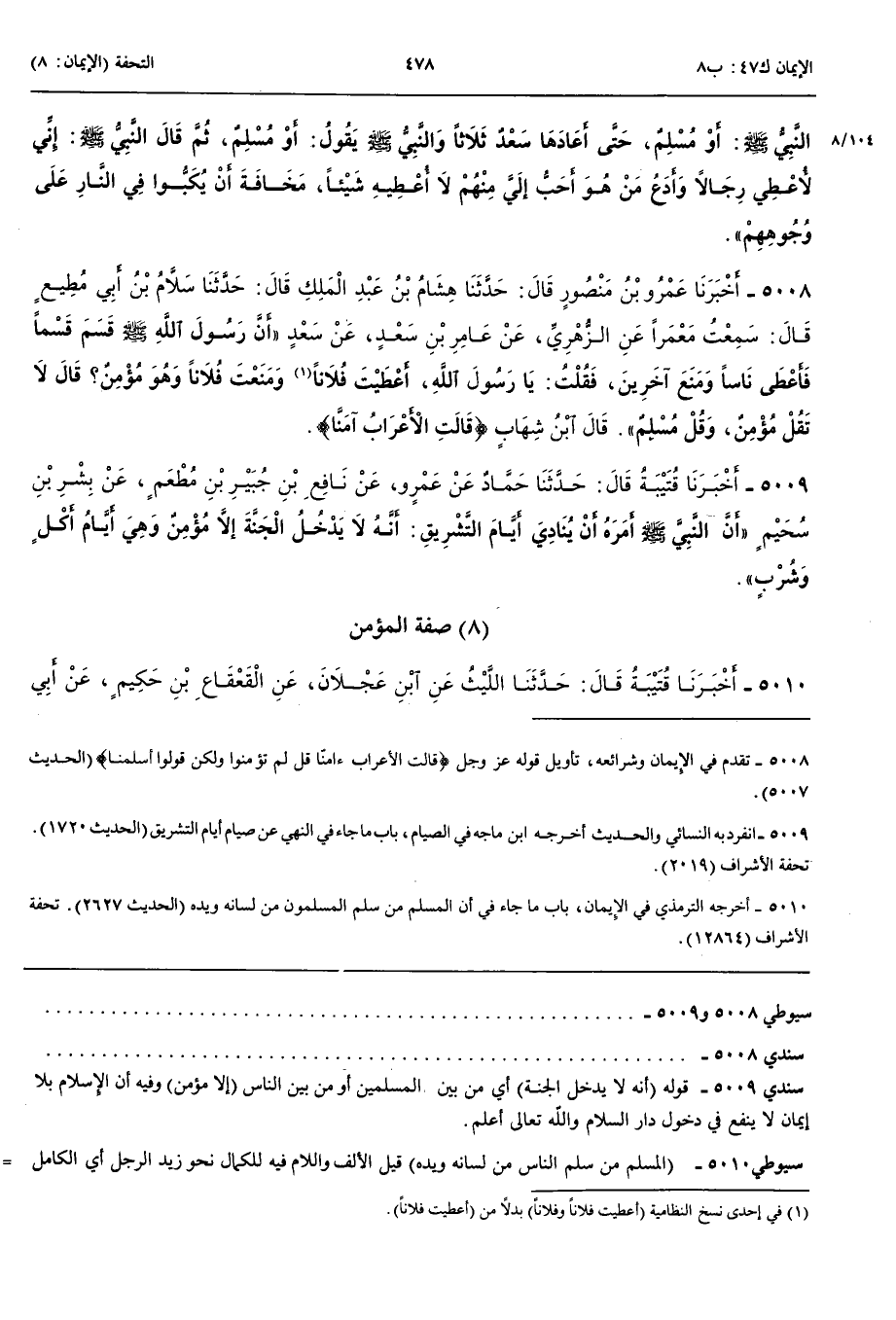 5008 - أَخْبَرَنَا عَمْرُو بْنُ مَنْصُورٍ قَالَ حَدَّثَنَا هِشَامُ بْنُ عَبْدِ الْمَلِكِ قَالَ حَدَّثَنَا سَلَّامُ بْنُ أَبِي مُطِيعٍ قَالَ سَمِعْتُ مَعْمَرًا عَنْ الزُّهْرِيِّ عَنْ عَامِرِ بْنِ سَعْدٍ عَنْ سَعْدٍ أَنَّ رَسُولَ اللَّهِ صَلَّى اللَّهُ عَلَيْهِ وَسَلَّمَ قَسَمَ قَسْمًا فَأَعْطَى نَاسًا وَمَنَعَ آخَرِينَ فَقُلْتُ يَا رَسُولَ اللَّهِ أَعْطَيْتَ فُلَانًا وَمَنَعْتَ فُلَانًا وَهُوَ مُؤْمِنٌ قَالَ لَا تَقُلْ مُؤْمِنٌ وَقُلْ مُسْلِمٌ قَالَ ابْنُ شِهَابٍ { قَالَتْ الْأَعْرَابُ آمَنَّا }