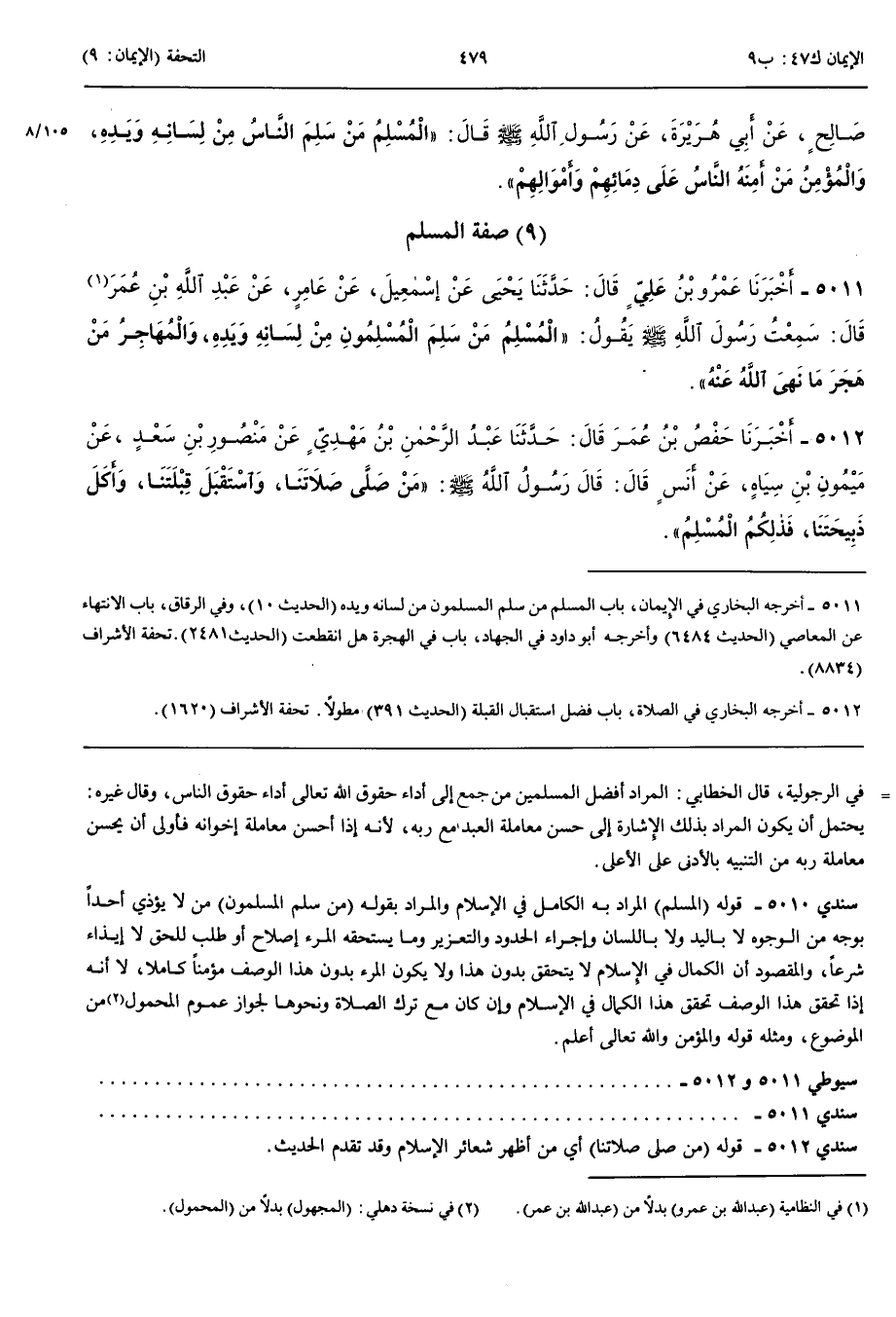 صِفَةُ الْمُسْلِمِ 5011 - أَخْبَرَنَا عَمْرُو بْنُ عَلِيٍّ قَالَ حَدَّثَنَا يَحْيَى عَنْ إِسْمَعِيلَ عَنْ عَامِرٍ عَنْ عَبْدِ اللَّهِ بْنِ عَمْرٍو قَالَ سَمِعْتُ رَسُولَ اللَّهِ صَلَّى اللَّهُ عَلَيْهِ وَسَلَّمَ يَقُولُ الْمُسْلِمُ مَنْ سَلِمَ الْمُسْلِمُونَ مِنْ لِسَانِهِ وَيَدِهِ وَالْمُهَاجِرُ مَنْ هَجَرَ مَا نَهَى اللَّهُ عَنْهُ