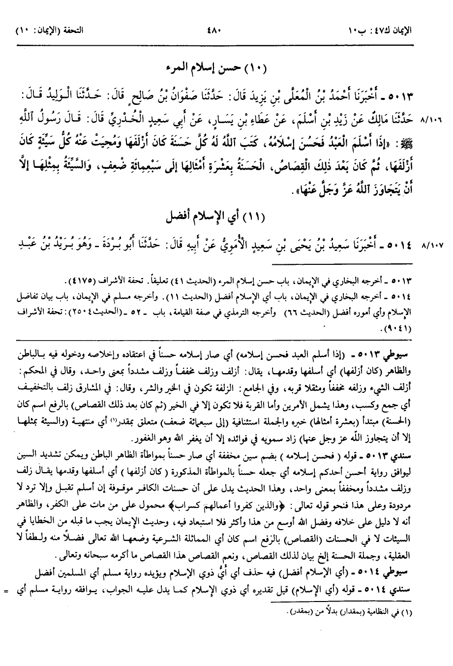 حُسْنُ إِسْلَامِ الْمَرْءِ 5013 - أَخْبَرَنِي أَحْمَدُ بْنُ الْمُعَلَّى بْنِ يَزِيدَ قَالَ حَدَّثَنَا صَفْوَانُ بْنُ صَالِحٍ قَالَ حَدَّثَنَا الْوَلِيدُ قَالَ حَدَّثَنَا مَالِكٌ عَنْ زَيْدِ بْنِ أَسْلَمَ عَنْ عَطَاءِ بْنِ يَسَارٍ عَنْ أَبِي سَعِيدٍ الْخُدْرِيِّ قَالَ قَالَ رَسُولُ اللَّهِ صَلَّى اللَّهُ عَلَيْهِ وَسَلَّمَ إِذَا أَسْلَمَ الْعَبْدُ فَحَسُنَ إِسْلَامُهُ كَتَبَ اللَّهُ لَهُ كُلَّ حَسَنَةٍ كَانَ أَزْلَفَهَا وَمُحِيَتْ عَنْهُ كُلُّ سَيِّئَةٍ كَانَ أَزْلَفَهَا ثُمَّ كَانَ بَعْدَ ذَلِكَ الْقِصَاصُ الْحَسَنَةُ بِعَشْرَةِ أَمْثَالِهَا إِلَى سَبْعِ مِائَةِ ضِعْفٍ وَالسَّيِّئَةُ بِمِثْلِهَا إِلَّا أَنْ يَتَجَاوَزَ اللَّهُ عَزَّ وَجَلَّ عَنْهَا