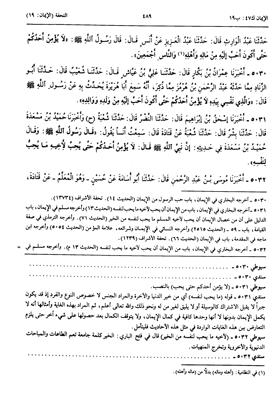 5030 - أَخْبَرَنَا عِمْرَانُ بْنُ بَكَّارٍ قَالَ حَدَّثَنَا عَلِيُّ بْنُ عَيَّاشٍ قَالَ حَدَّثَنَا شُعَيْبٌ قَالَ حَدَّثَنَا أَبُو الزِّنَادِ مِمَّا حَدَّثَهُ عَبْدُ الرَّحْمَنِ بْنُ هُرْمُزَ مِمَّا ذُكِرَ أَنَّهُ سَمِعَ أَبَا هُرَيْرَةَ يُحَدِّثُ بِهِ عَنْ رَسُولِ اللَّهِ صَلَّى اللَّهُ عَلَيْهِ وَسَلَّمَ قَالَ وَالَّذِي نَفْسِي بِيَدِهِ لَا يُؤْمِنُ أَحَدُكُمْ حَتَّى أَكُونَ أَحَبَّ إِلَيْهِ مِنْ وَلَدِهِ وَوَالِدِهِ