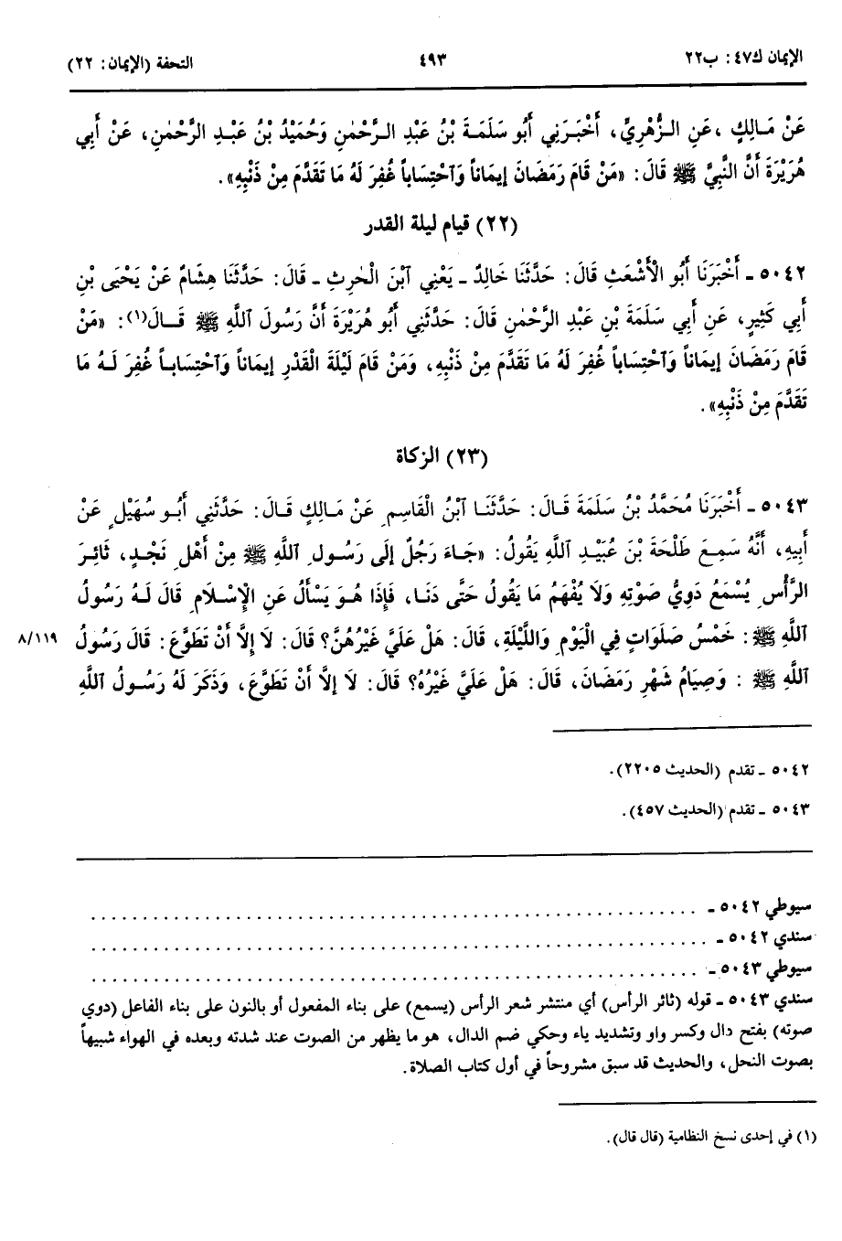 الزَّكَاةُ 5043 - أَخْبَرَنَا مُحَمَّدُ بْنُ سَلَمَةَ قَالَ حَدَّثَنَا ابْنُ الْقَاسِمِ عَنْ مَالِكٍ قَالَ حَدَّثَنِي أَبُو سُهَيْلٍ عَنْ أَبِيهِ أَنَّهُ سَمِعَ طَلْحَةَ بْنَ عُبَيْدِ اللَّهِ يَقُولُ جَاءَ رَجُلٌ إِلَى رَسُولِ اللَّهِ صَلَّى اللَّهُ عَلَيْهِ وَسَلَّمَ مِنْ أَهْلِ نَجْدٍ ثَائِرَ الرَّأْسِ يُسْمَعُ دَوِيُّ صَوْتِهِ وَلَا يُفْهَمُ مَا يَقُولُ حَتَّى دَنَا فَإِذَا هُوَ يَسْأَلُ عَنْ الْإِسْلَامِ قَالَ لَهُ رَسُولُ اللَّهِ صَلَّى اللَّهُ عَلَيْهِ وَسَلَّمَ خَمْسُ صَلَوَاتٍ فِي الْيَوْمِ وَاللَّيْلَةِ قَالَ هَلْ عَلَيَّ غَيْرُهُنَّ قَالَ لَا إِلَّا أَنْ تَطَوَّعَ قَالَ رَسُولُ اللَّهِ صَلَّى اللَّهُ عَلَيْهِ وَسَلَّمَ وَصِيَامُ شَهْرِ رَمَضَانَ قَالَ هَلْ عَلَيَّ غَيْرُهُ قَالَ لَا إِلَّا أَنْ تَطَوَّعَ وَذَكَرَ لَهُ رَسُولُ اللَّهِ صَلَّى اللَّهُ عَلَيْهِ وَسَلَّمَ الزَّكَاةَ فَقَالَ هَلْ عَلَيَّ غَيْرُهَا قَالَ لَا إِلَّا أَنْ تَطَوَّعَ فَأَدْبَرَ الرَّجُلُ وَهُوَ يَقُولُ لَا أَزِيدُ عَلَى هَذَا وَلَا أَنْقُصُ مِنْهُ فَقَالَ رَسُولُ اللَّهِ صَلَّى اللَّهُ عَلَيْهِ وَسَلَّمَ أَفْلَحَ إِنْ صَدَقَ