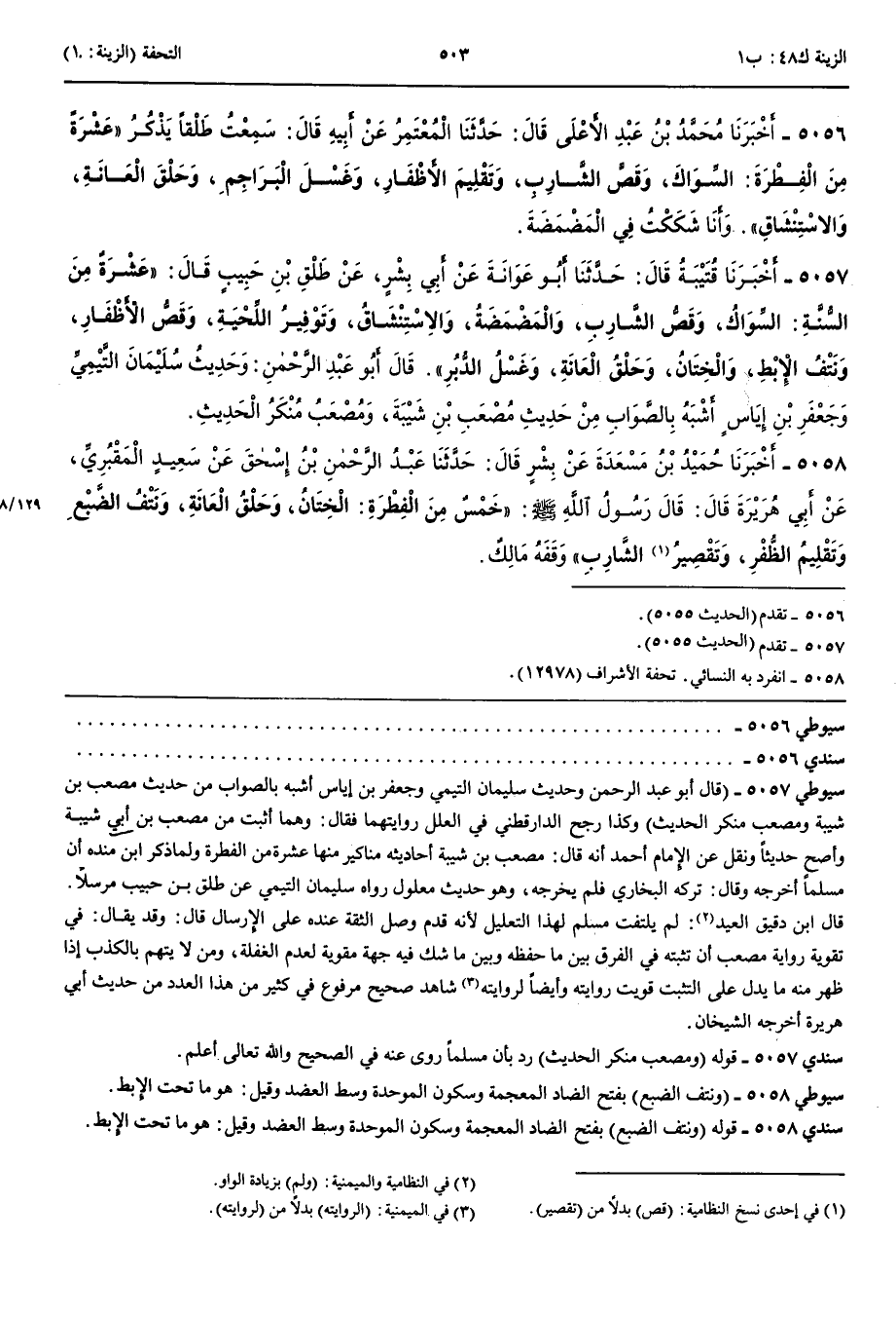 4956 - أَخْبَرَنَا قُتَيْبَةُ قَالَ حَدَّثَنَا أَبُو عَوَانَةَ عَنْ أَبِي بِشْرٍ عَنْ طَلْقِ بْنِ حَبِيبٍ قَالَ عَشْرَةٌ مِنْ السُّنَّةِ السِّوَاكُ وَقَصُّ الشَّارِبِ وَالْمَضْمَضَةُ وَالِاسْتِنْشَاقُ وَتَوْفِيرُ اللِّحْيَةِ وَقَصُّ الْأَظْفَارِ وَنَتْفُ الْإِبْطِ وَالْخِتَانُ وَحَلْقُ الْعَانَةِ وَغَسْلُ الدُّبُرِ قَالَ أَبُو عَبْد الرَّحْمَنِ وَحَدِيثُ سُلَيْمَانَ التَّيْمِيِّ وَجَعْفَرِ بْنِ إِيَاسٍ أَشْبَهُ بِالصَّوَابِ مِنْ حَدِيثِ مُصْعَبِ بْنِ شَيْبَةَ وَمُصْعَبٌ مُنْكَرُ الْحَدِيثِ