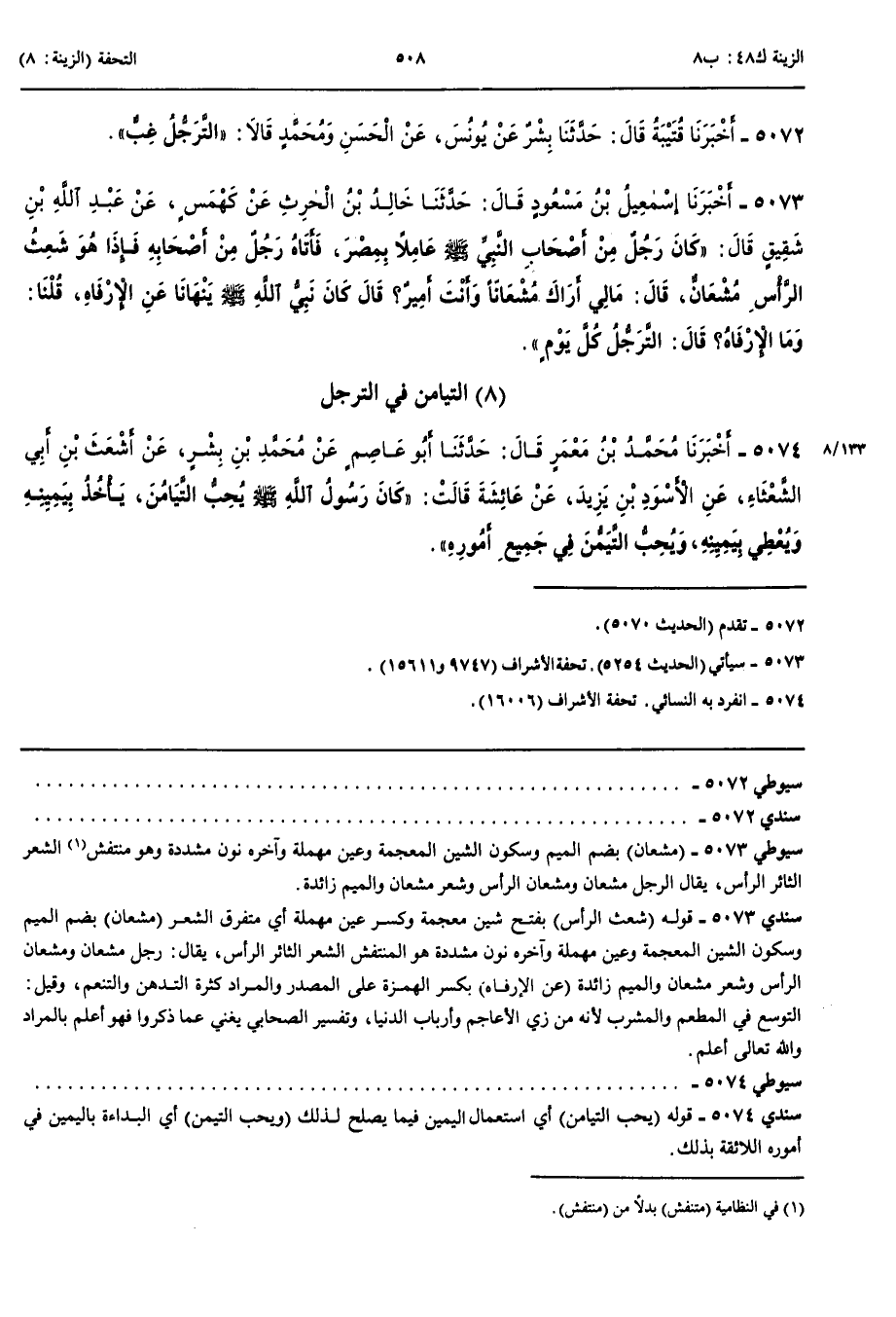 5073 - أَخْبَرَنَا إِسْمَعِيلُ بْنُ مَسْعُودٍ قَالَ حَدَّثَنَا خَالِدُ بْنُ الْحَارِثِ عَنْ كَهْمَسٍ عَنْ عَبْدِ اللَّهِ بْنِ شَقِيقٍ قَالَ كَانَ رَجُلٌ مِنْ أَصْحَابِ النَّبِيِّ صَلَّى اللَّهُ عَلَيْهِ وَسَلَّمَ عَامِلًا بِمِصْرَ فَأَتَاهُ رَجُلٌ مِنْ أَصْحَابِهِ فَإِذَا هُوَ شَعِثُ الرَّأْسِ مُشْعَانٌّ قَالَ مَا لِي أَرَاكَ مُشْعَانًّا وَأَنْتَ أَمِيرٌ قَالَ كَانَ نَبِيُّ اللَّهِ صَلَّى اللَّهُ عَلَيْهِ وَسَلَّمَ يَنْهَانَا عَنْ الْإِرْفَاهِ قُلْنَا وَمَا الْإِرْفَاهُ قَالَ التَّرَجُّلُ كُلَّ يَوْمٍ