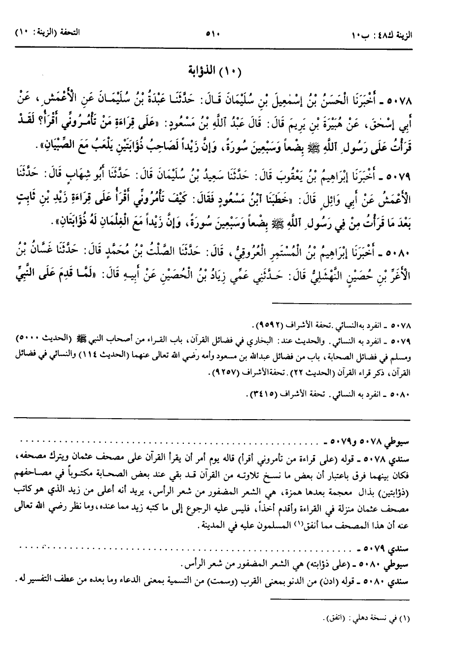 الذُّؤَابَةُ 5078 - أَخْبَرَنَا الْحَسَنُ بْنُ إِسْمَعِيلَ بْنِ سُلَيْمَانَ قَالَ حَدَّثَنَا عَبْدَةُ بْنُ سُلَيْمَانَ عَنْ الْأَعْمَشِ عَنْ أَبِي إِسْحَقَ عَنْ هُبَيْرَةَ بْنِ يَرِيمَ قَالَ قَالَ عَبْدُ اللَّهِ بْنُ مَسْعُودٍ عَلَى قِرَاءَةِ مَنْ تَأْمُرُونِّي أَقْرَأُ لَقَدْ قَرَأْتُ عَلَى رَسُولِ اللَّهِ صَلَّى اللَّهُ عَلَيْهِ وَسَلَّمَ بِضْعًا وَسَبْعِينَ سُورَةً وَإِنَّ زَيْدًا لَصَاحِبُ ذُؤَابَتَيْنِ يَلْعَبُ مَعَ الصِّبْيَانِ