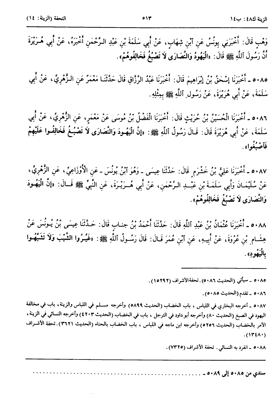 5087 - أَخْبَرَنَا عَلِيُّ بْنُ خَشْرَمٍ قَالَ حَدَّثَنَا عِيسَى وَهُوَ ابْنُ يُونُسَ عَنْ الْأَوْزَاعِيِّ عَنْ الزُّهْرِيِّ عَنْ سُلَيْمَانَ وَأَبِي سَلَمَةَ بْنِ عَبْدِ الرَّحْمَنِ عَنْ أَبِي هُرَيْرَةَ عَنْ النَّبِيِّ صَلَّى اللَّهُ عَلَيْهِ وَسَلَّمَ قَالَ إِنَّ الْيَهُودَ وَالنَّصَارَى لَا تَصْبُغُ فَخَالِفُوهُمْ