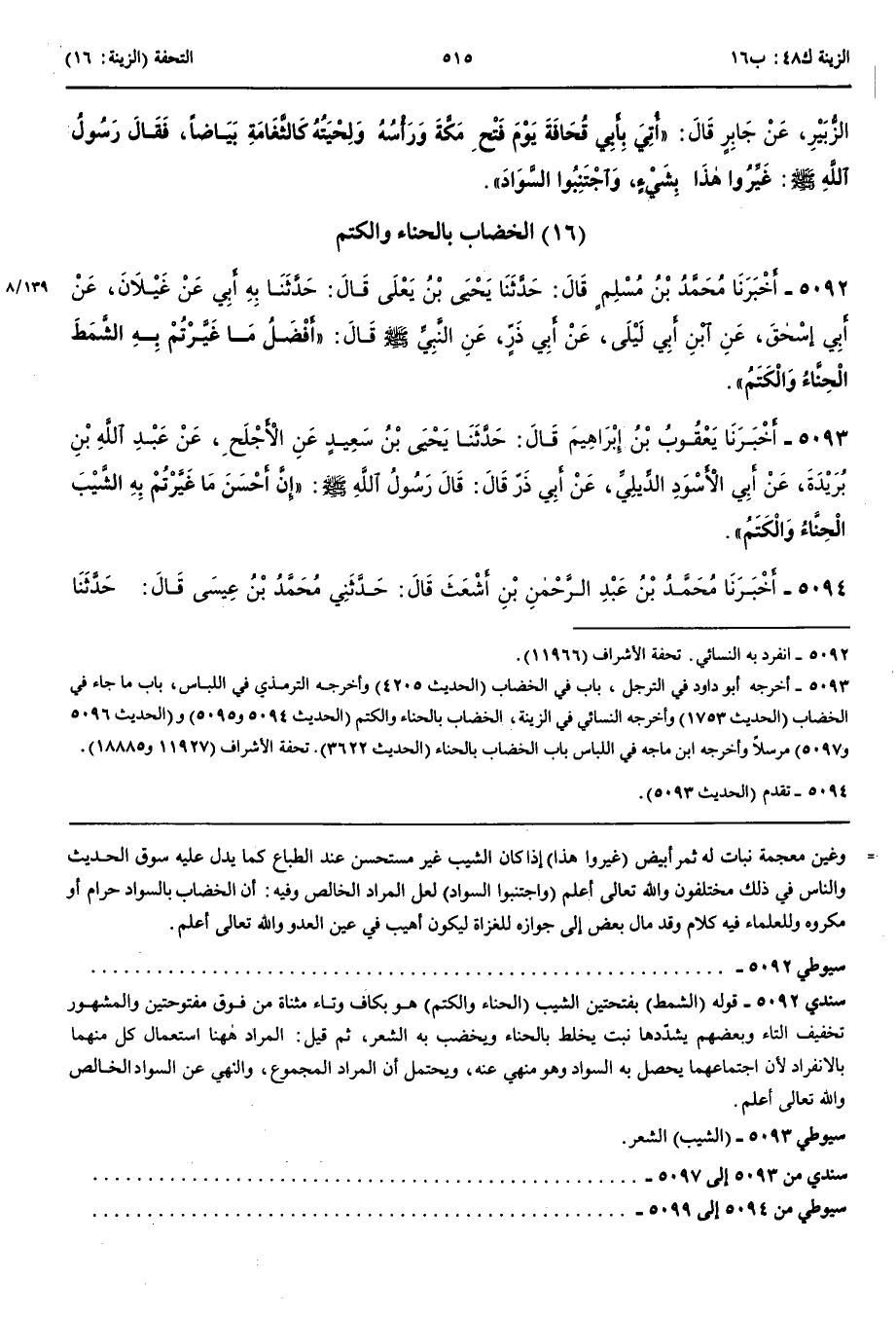 5094 - أَخْبَرَنَا مُحَمَّدُ بْنُ عَبْدِ الرَّحْمَنِ بْنِ أَشْعَثَ قَالَ حَدَّثَنِي مُحَمَّدُ بْنُ عِيسَى قَالَ حَدَّثَنَا هُشَيْمٌ قَالَ أَخْبَرَنِي ابْنُ أَبِي لَيْلَى عَنْ الْأَجْلَحِ فَلَقِيتُ الْأَجْلَحَ فَحَدَّثَنِي عَنْ ابْنِ بُرَيْدَةَ عَنْ أَبِي الْأَسْوَدِ الدِّيْلِيِّ عَنْ أَبِي ذَرٍّ قَالَ سَمِعْتُ النَّبِيَّ صَلَّى اللَّهُ عَلَيْهِ وَسَلَّمَ يَقُولُ إِنَّ مِنْ أَحْسَنِ مَا غَيَّرْتُمْ بِهِ الشَّيْبَ الْحِنَّاءَ وَالْكَتَمَ