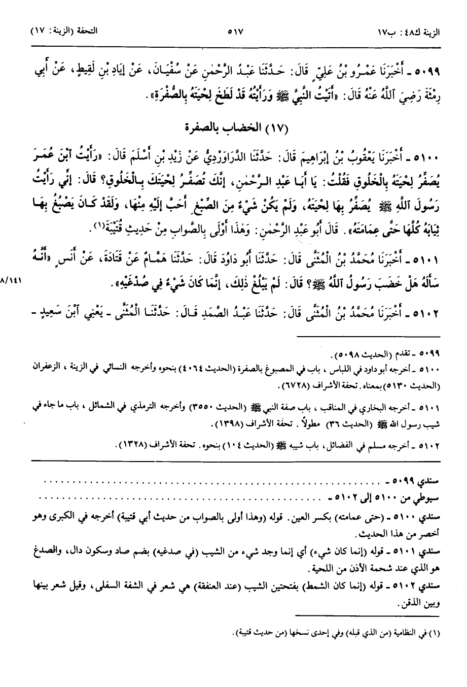 5099 - أَخْبَرَنَا عَمْرُو بْنُ عَلِيٍّ قَالَ حَدَّثَنَا عَبْدُ الرَّحْمَنِ عَنْ سُفْيَانَ عَنْ إِيَادِ بْنِ لَقِيطٍ عَنْ أَبِي رِمْثَةَ رَضِيَ اللَّهُ عَنْهُ قَالَ أَتَيْتُ النَّبِيَّ صَلَّى اللَّهُ عَلَيْهِ وَسَلَّمَ وَرَأَيْتُهُ قَدْ لَطَخَ لِحْيَتَهُ بِالصُّفْرَةِ