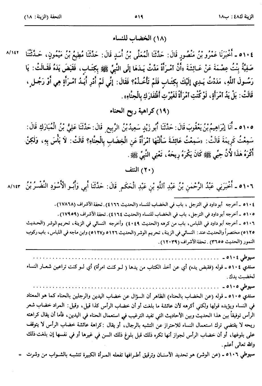 النَّتْفُ 5106 - أَخْبَرَنَا عَبْدُ الرَّحْمَنِ بْنُ عَبْدِ اللَّهِ بْنِ عَبْدِ الْحَكَمِ قَالَ حَدَّثَنَا أَبِي وَأَبُو الْأَسْوَدِ النَّضْرُ بْنُ عَبْدِ الْجَبَّارِ قَالَا حَدَّثَنَا الْمُفَضَّلُ بْنُ فَضَالَةَ عَنْ عَيَّاشِ بْنِ عَبَّاسٍ الْقِتْبَانِيِّ عَنْ أَبِي الْحُصَيْنِ الْهَيْثَمِ بْنِ شُفَيٍّ وَقَالَ أَبُو الْأَسْوَدِ شُفَيٌّ إِنَّهُ سَمِعَهُ يَقُولُ خَرَجْتُ أَنَا وَصَاحِبٌ لِي يُسَمَّى أَبَا عَامِرٍ رَجُلٌ مِنْ الْمَعَافِرِ لِنُصَلِّيَ بِإِيلِيَاءَ وَكَانَ قَاصُّهُمْ رَجُلًا مِنْ الْأَزْدِ يُقَالُ لَهُ أَبُو رَيْحَانَةَ مِنْ الصَّحَابَةِ قَالَ أَبُو الْحُصَيْنِ فَسَبَقَنِي صَاحِبِي إِلَى الْمَسْجِدِ ثُمَّ أَدْرَكْتُهُ فَجَلَسْتُ إِلَى جَنْبِهِ فَقَالَ هَلْ أَدْرَكْتَ قَصَصَ أَبِي رَيْحَانَةَ فَقُلْتُ لَا فَقَالَ سَمِعْتُهُ يَقُولُ نَهَى رَسُولُ اللَّهِ صَلَّى اللَّهُ عَلَيْهِ وَسَلَّمَ عَنْ عَشْرٍ عَنْ الْوَشْرِ وَالْوَشْمِ وَالنَّتْفِ وَعَنْ مُكَامَعَةِ الرَّجُلِ الرَّجُلَ بِغَيْرِ شِعَارٍ وَعَنْ مُكَامَعَةِ الْمَرْأَةِ الْمَرْأَةَ بِغَيْرِ شِعَارٍ وَأَنْ يَجْعَلَ الرَّجُلُ أَسْفَلَ ثِيَابِهِ حَرِيرًا مِثْلَ الْأَعَاجِمِ أَوْ يَجْعَلَ عَلَى مَنْكِبَيْهِ حَرِيرًا أَمْثَالَ الْأَعَاجِمِ وَعَنْ النُّهْبَى وَعَنْ رُكُوبِ النُّمُورِ وَلُبُوسِ الْخَوَاتِيمِ إِلَّا لِذِي سُلْطَانٍ