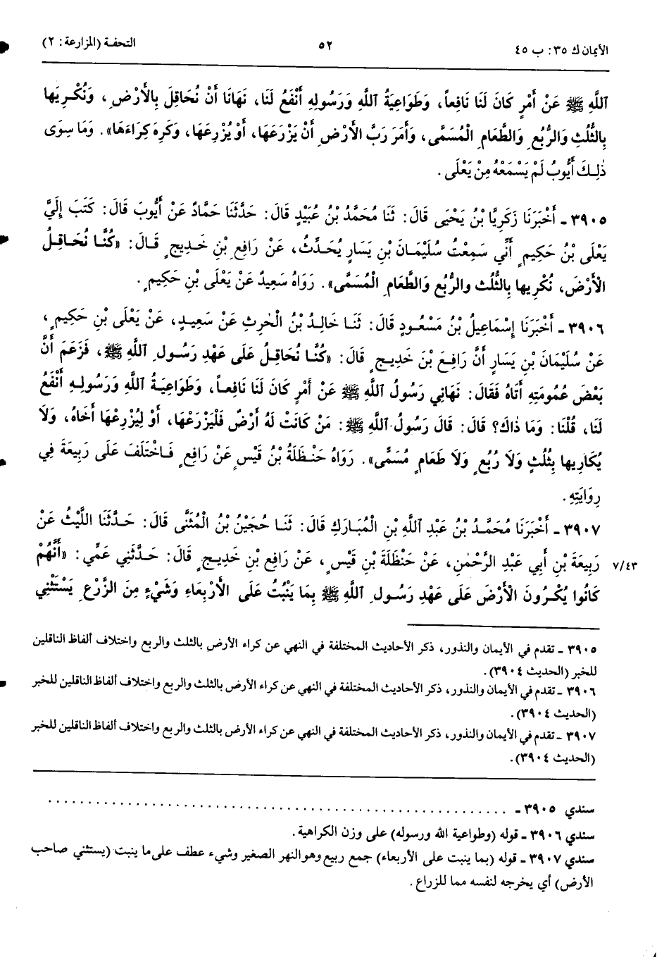 3905 - أَخْبَرَنِي زَكَرِيَّا بْنُ يَحْيَى قَالَ حَدَّثَنَا مُحَمَّدُ بْنُ عُبَيْدٍ قَالَ حَدَّثَنَا حَمَّادٌ عَنْ أَيُّوبَ قَالَ كَتَبَ إِلَيَّ يَعْلَى بْنُ حَكِيمٍ إِنِّي سَمِعْتُ سُلَيْمَانَ بْنَ يَسَارٍ يُحَدِّثُ عَنْ رَافِعِ بْنِ خَدِيجٍ قَالَ كُنَّا نُحَاقِلُ الْأَرْضَ نُكْرِيهَا بِالثُّلُثِ وَالرُّبُعِ وَالطَّعَامِ الْمُسَمَّى رَوَاهُ سَعِيدٌ عَنْ يَعْلَى بْنِ حَكِيمٍ