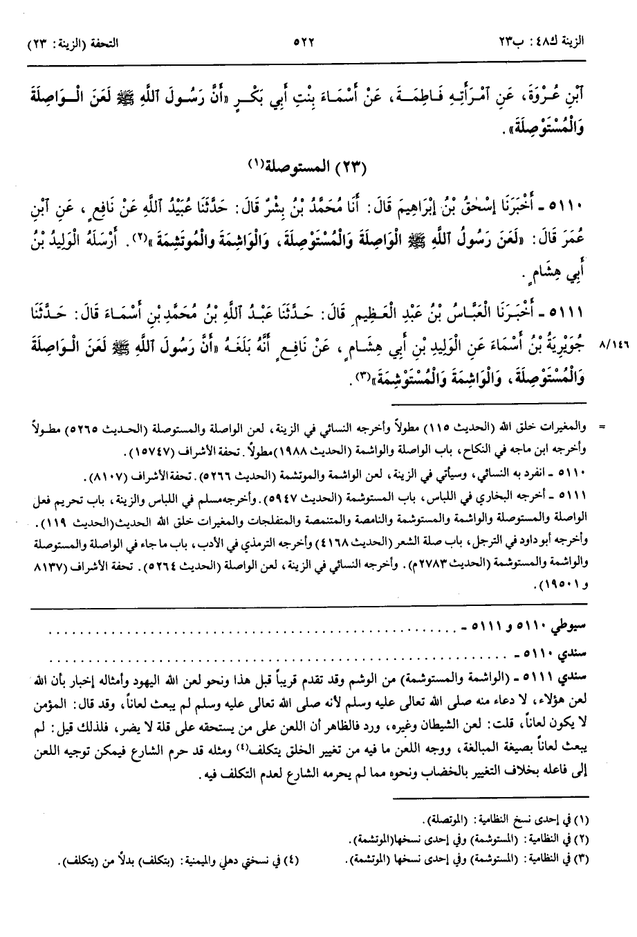 الْمُسْتَوْصِلَةُ 5110 - أَخْبَرَنَا إِسْحَقُ بْنُ إِبْرَاهِيمَ قَالَ حَدَّثَنَا مُحَمَّدُ بْنُ بِشْرٍ قَالَ حَدَّثَنَا عُبَيْدُ اللَّهِ عَنْ نَافِعٍ عَنْ ابْنِ عُمَرَ قَالَ لَعَنَ رَسُولُ اللَّهِ صَلَّى اللَّهُ عَلَيْهِ وَسَلَّمَ الْوَاصِلَةَ وَالْمُسْتَوْصِلَةَ وَالْوَاشِمَةَ وَالْمُوتَشِمَةَ أَرْسَلَهُ الْوَلِيدُ بْنُ أَبِي هِشَامٍ