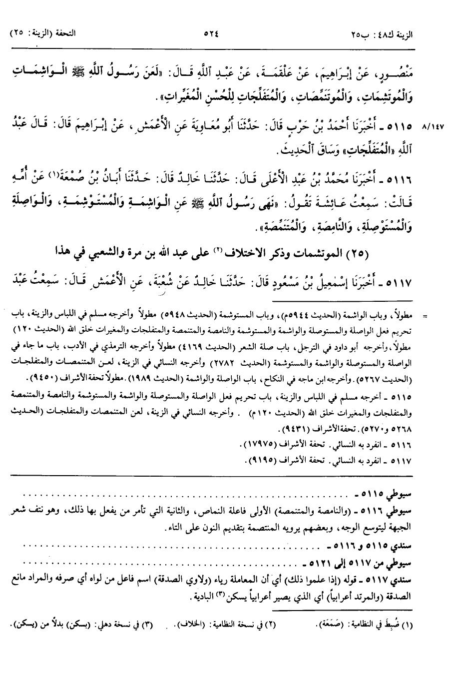 الْمُوتَشِمَاتُ وَذِكْرُ الِاخْتِلَافِ عَلَى عَبْدِ اللَّهِ بْنِ مُرَّةَ وَالشَّعْبِيِّ فِي هَذَا 5117 - أَخْبَرَنَا إِسْمَعِيلُ بْنُ مَسْعُودٍ قَالَ حَدَّثَنَا خَالِدٌ عَنْ شُعْبَةَ عَنْ الْأَعْمَشِ قَالَ سَمِعْتُ عَبْدَ اللَّهِ بْنَ مُرَّةَ يُحَدِّثُ عَنْ الْحَارِثِ عَنْ عَبْدِ اللَّهِ قَالَ آكِلُ الرِّبَا وَمُوكِلُهُ وَكَاتِبُهُ إِذَا عَلِمُوا ذَلِكَ وَالْوَاشِمَةُ وَالْمَوْشُومَةُ لِلْحُسْنِ وَلَاوِي الصَّدَقَةِ وَالْمُرْتَدُّ أَعْرَابِيًّا بَعْدَ الْهِجْرَةِ مَلْعُونُونَ عَلَى لِسَانِ مُحَمَّدٍ صَلَّى اللَّهُ عَلَيْهِ وَسَلَّمَ يَوْمَ الْقِيَامَةِ