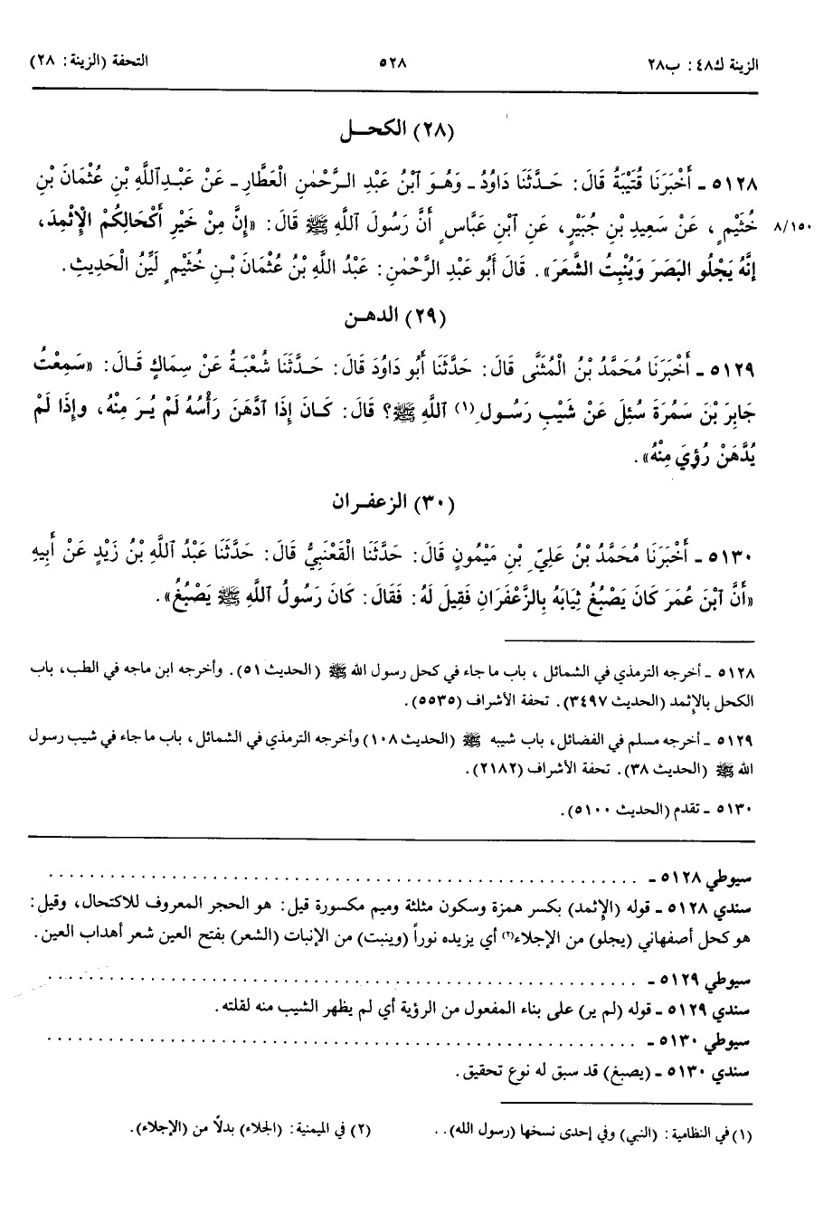 الْكُحْلُ 5128 - أَخْبَرَنَا قُتَيْبَةُ قَالَ حَدَّثَنَا دَاوُدُ وَهُوَ ابْنُ عَبْدِ الرَّحْمَنِ الْعَطَّارُ عَنْ عَبْدِ اللَّهِ بْنِ عُثْمَانَ بْنِ خُثَيْمٍ عَنْ سَعِيدِ بْنِ جُبَيْرٍ عَنْ ابْنِ عَبَّاسٍ أَنَّ رَسُولَ اللَّهِ صَلَّى اللَّهُ عَلَيْهِ وَسَلَّمَ قَالَ إِنَّ مِنْ خَيْرِ أَكْحَالِكُمُ الْإِثْمِدَ إِنَّهُ يَجْلُو الْبَصَرَ وَيُنْبِتُ الشَّعَرَ أَبُو عَبْد الرَّحْمَنِ عَبْدُ اللَّهِ بْنُ عُثْمَانَ بْنِ خُثَيْمٍ لَيِّنُ الْحَدِيثِ