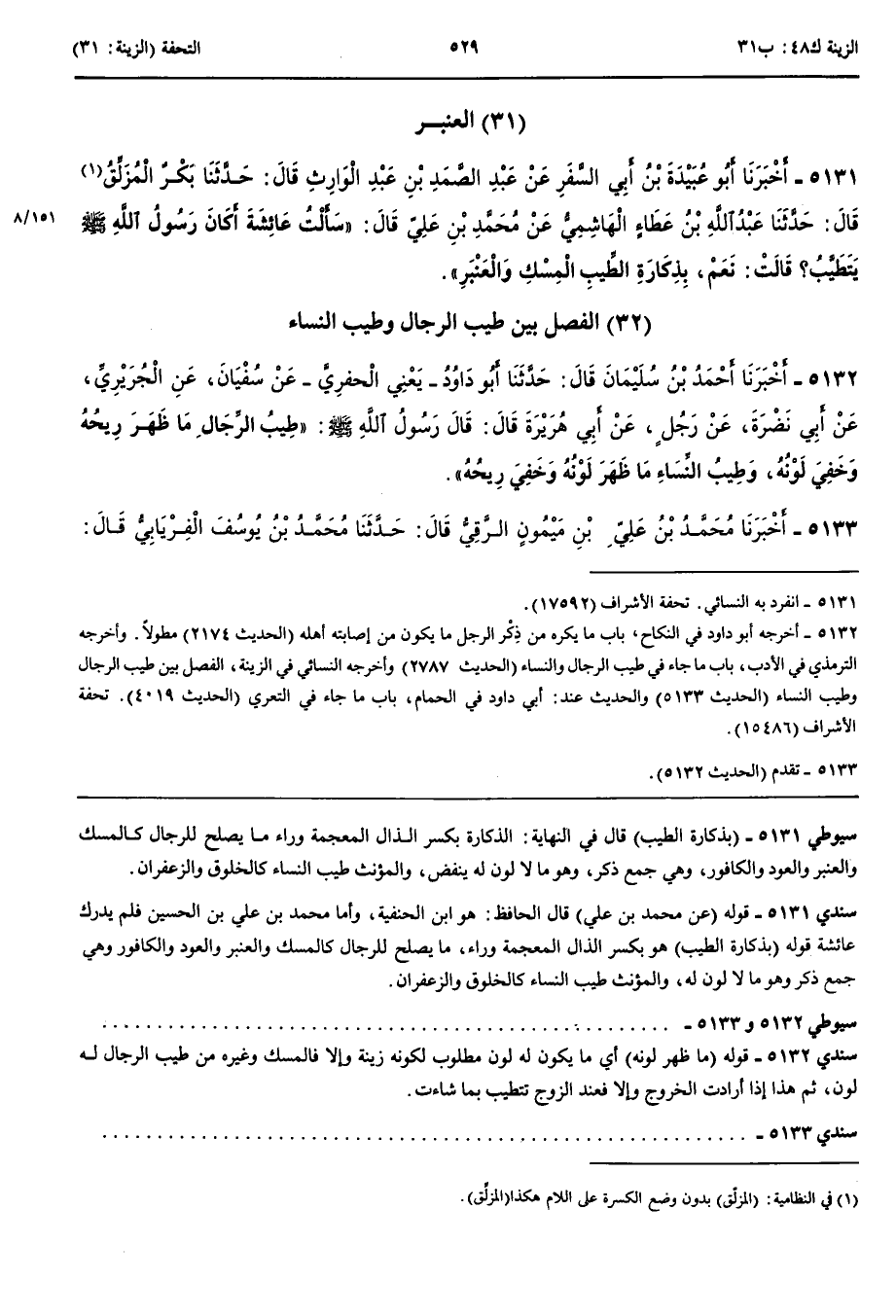 الْعَنْبَرُ 5131 - أَخْبَرَنَا أَبُو عُبَيْدَةَ بْنُ أَبِي السَّفَرِ عَنْ عَبْدِ الصَّمَدِ بْنِ عَبْدِ الْوَارِثِ قَالَ حَدَّثَنَا بَكْرٌ الْمُزَلِّقُ قَالَ حَدَّثَنَا عَبْدُ اللَّهِ بْنُ عَطَاءٍ الْهَاشِمِيُّ عَنْ مُحَمَّدِ بْنِ عَلِيٍّ قَالَ سَأَلْتُ عَائِشَةَ أَكَانَ رَسُولُ اللَّهِ صَلَّى اللَّهُ عَلَيْهِ وَسَلَّمَ يَتَطَيَّبُ قَالَتْ نَعَمْ بِذِكَارَةِ الطِّيبِ الْمِسْكِ وَالْعَنْبَرِ