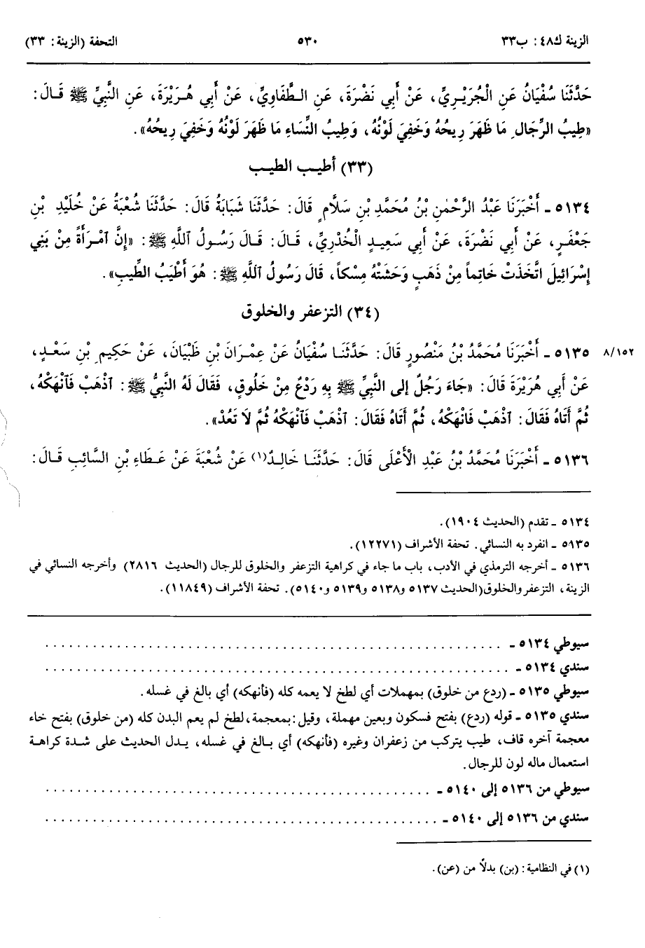 التَّزَعْفُرُ وَالْخَلُوقُ 5135 - أَخْبَرَنَا مُحَمَّدُ بْنُ مَنْصُورٍ قَالَ حَدَّثَنَا سُفْيَانُ عَنْ عِمْرَانَ بْنِ ظَبْيَانَ عَنْ حُكَيْمِ بْنِ سَعْدٍ عَنْ أَبِي هُرَيْرَةَ قَالَ جَاءَ رَجُلٌ إِلَى النَّبِيِّ صَلَّى اللَّهُ عَلَيْهِ وَسَلَّمَ بِهِ رَدْعٌ مِنْ خَلُوقٍ فَقَالَ لَهُ النَّبِيُّ صَلَّى اللَّهُ عَلَيْهِ وَسَلَّمَ اذْهَبْ فَانْهَكْهُ ثُمَّ أَتَاهُ فَقَالَ اذْهَبْ فَانْهَكْهُ ثُمَّ أَتَاهُ فَقَالَ اذْهَبْ فَانْهَكْهُ ثُمَّ لَا تَعُدْ