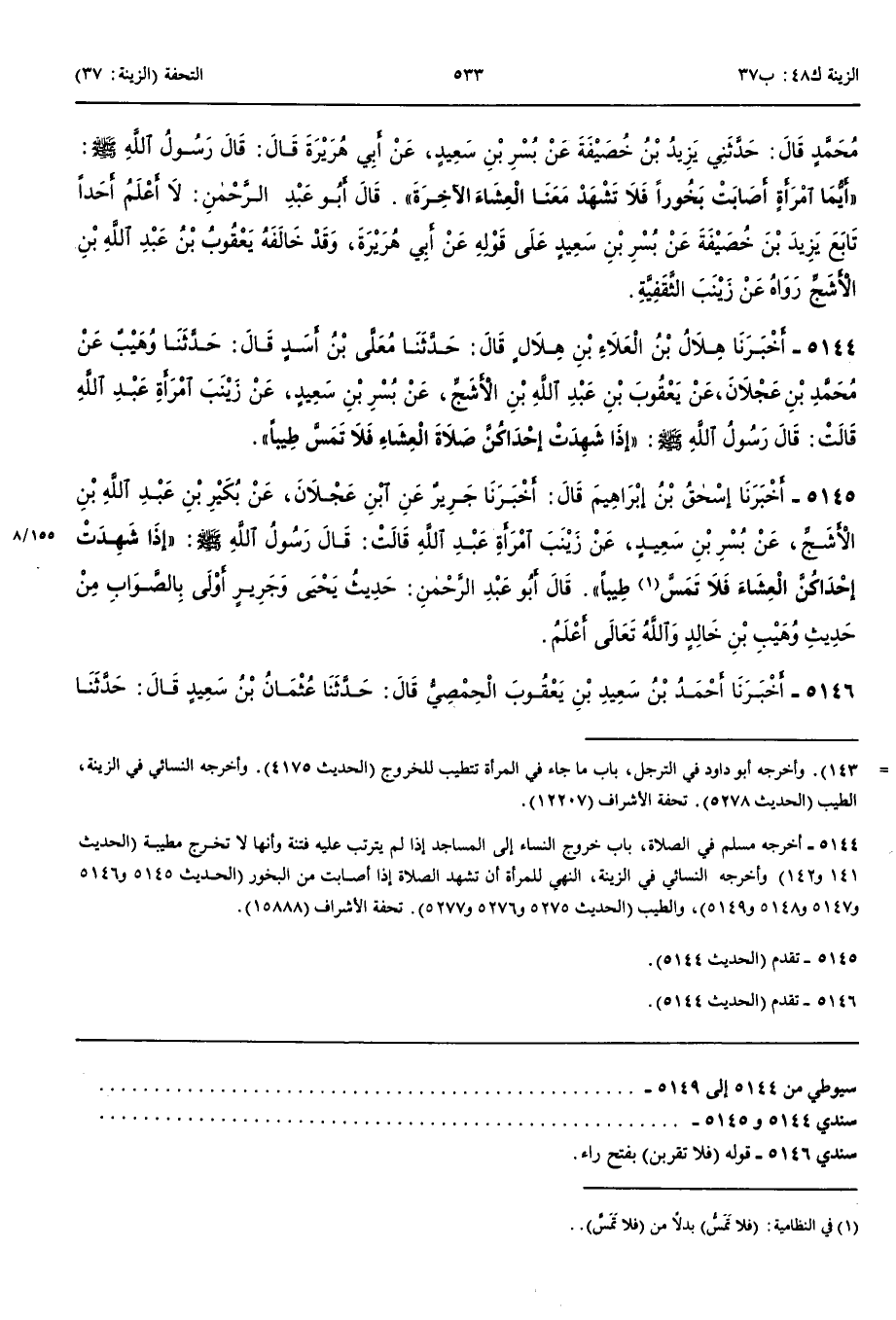 5145 - أَخْبَرَنَا إِسْحَقُ بْنُ إِبْرَاهِيمَ قَالَ أَنْبَأَنَا جَرِيرٌ عَنْ ابْنِ عَجْلَانَ عَنْ بُكَيْرِ بْنِ عَبْدِ اللَّهِ بْنِ الْأَشَجِّ عَنْ بُسْرِ بْنِ سَعِيدٍ عَنْ زَيْنَبَ امْرَأَةِ عَبْدِ اللَّهِ قَالَتْ قَالَ رَسُولُ اللَّهِ صَلَّى اللَّهُ عَلَيْهِ وَسَلَّمَ إِذَا شَهِدَتْ إِحْدَاكُنَّ الْعِشَاءَ فَلَا تَمَسَّ طِيبًا قَالَ أَبُو عَبْد الرَّحْمَنِ حَدِيثُ يَحْيَى وَجَرِيرٍ أَوْلَى بِالصَّوَابِ مِنْ حَدِيثِ وُهَيْبِ بْنِ خَالِدٍ وَاللَّهُ تَعَالَى أَعْلَمُ