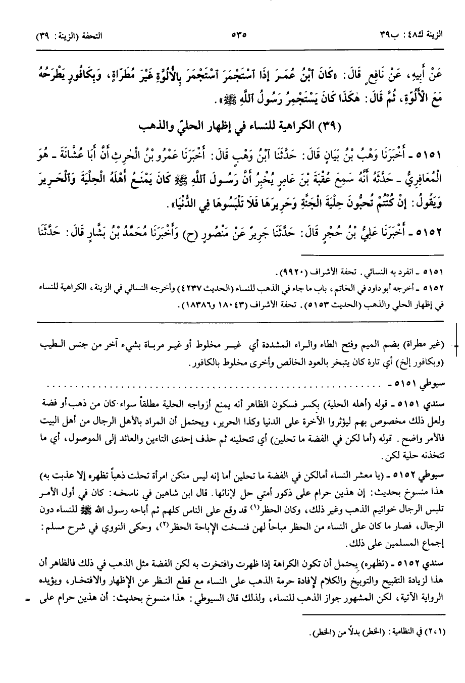 الْكَرَاهِيَةُ لِلنِّسَاءِ فِي إِظْهَارِ الْحُلِيِّ وَالذَّهَبِ 5151 - أَخْبَرَنَا وَهْبُ بْنُ بَيَانٍ قَالَ حَدَّثَنَا ابْنُ وَهْبٍ قَالَ أَنْبَأَنَا عَمْرُو بْنُ الْحَارِثِ أَنَّ أَبَا عُشَّانَةَ هُوَ الْمَعَافِرِيُّ حَدَّثَهُ أَنَّهُ سَمِعَ عُقْبَةَ بْنَ عَامِرٍ يُخْبِرُ أَنَّ رَسُولَ اللَّهِ صَلَّى اللَّهُ عَلَيْهِ وَسَلَّمَ كَانَ يَمْنَعُ أَهْلَهُ الْحِلْيَةَ وَالْحَرِيرَ وَيَقُولُ إِنْ كُنْتُمْ تُحِبُّونَ حِلْيَةَ الْجَنَّةِ وَحَرِيرَهَا فَلَا تَلْبَسُوهَا فِي الدُّنْيَا