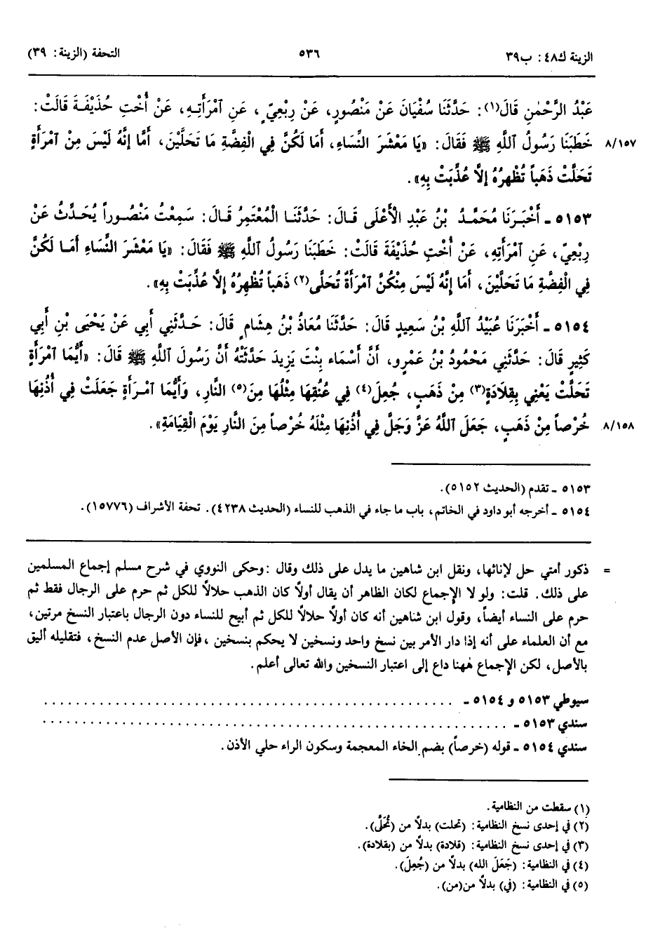 5153 - أَخْبَرَنَا مُحَمَّدُ بْنُ عَبْدِ الْأَعْلَى قَالَ حَدَّثَنَا الْمُعْتَمِرُ قَالَ سَمِعْتُ مَنْصُورًا يُحَدِّثُ عَنْ رِبْعِيٍّ عَنْ امْرَأَتِهِ عَنْ أُخْتِ حُذَيْفَةَ قَالَتْ خَطَبَنَا رَسُولُ اللَّهِ صَلَّى اللَّهُ عَلَيْهِ وَسَلَّمَ فَقَالَ يَا مَعْشَرَ النِّسَاءِ أَمَا لَكُنَّ فِي الْفِضَّةِ مَا تَحَلَّيْنَ أَمَا إِنَّهُ لَيْسَ مِنْكُنَّ امْرَأَةٌ تُحَلَّى ذَهَبًا تُظْهِرُهُ إِلَّا عُذِّبَتْ بِهِ