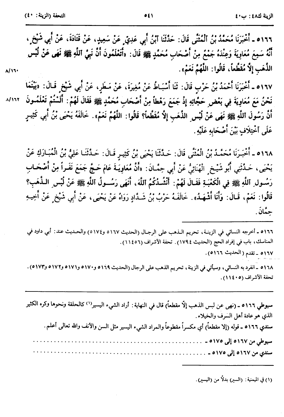 5167 - أَخْبَرَنَا أَحْمَدُ بْنُ حَرْبٍ قَالَ أَنْبَأَنَا أَسْبَاطٌ عَنْ مُغِيرَةَ عَنْ مَطَرٍ عَنْ أَبِي شَيْخٍ قَالَ بَيْنَمَا نَحْنُ مَعَ مُعَاوِيَةَ فِي بَعْضِ حَجَّاتِهِ إِذْ جَمَعَ رَهْطًا مِنْ أَصْحَابِ مُحَمَّدٍ صَلَّى اللَّهُ عَلَيْهِ وَسَلَّمَ فَقَالَ لَهُمْ أَلَسْتُمْ تَعْلَمُونَ أَنَّ رَسُولَ اللَّهِ صَلَّى اللَّهُ عَلَيْهِ وَسَلَّمَ نَهَى عَنْ لُبْسِ الذَّهَبِ إِلَّا مُقَطَّعًا قَالُوا اللَّهُمَّ نَعَمْ خَالَفَهُ يَحْيَى بْنُ أَبِي كَثِيرٍ عَلَى اخْتِلَافٍ بَيْنَ أَصْحَابِهِ عَلَيْهِ