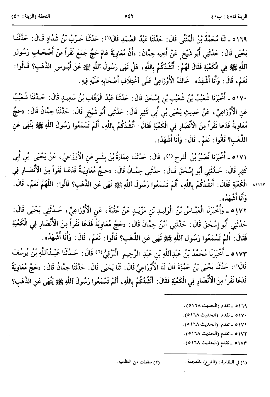 5169 - أَخْبَرَنَا مُحَمَّدُ بْنُ الْمُثَنَّى قَالَ حَدَّثَنَا عَبْدُ الصَّمَدِ قَالَ حَدَّثَنَا حَرْبُ بْنُ شَدَّادٍ قَالَ حَدَّثَنَا يَحْيَى قَالَ حَدَّثَنِي أَبُو شَيْخٍ عَنْ أَخِيهِ حِمَّانَ أَنَّ مُعَاوِيَةَ عَامَ حَجَّ جَمَعَ نَفَرًا مِنْ أَصْحَابِ رَسُولِ اللَّهِ صَلَّى اللَّهُ عَلَيْهِ وَسَلَّمَ فِي الْكَعْبَةِ فَقَالَ لَهُمْ أَنْشُدُكُمْ بِاللَّهِ هَلْ نَهَى رَسُولُ اللَّهِ صَلَّى اللَّهُ عَلَيْهِ وَسَلَّمَ عَنْ لُبُوسِ الذَّهَبِ قَالُوا نَعَمْ قَالَ وَأَنَا أَشْهَدُ خَالَفَهُ الْأَوْزَاعِيُّ عَلَى اخْتِلَافِ أَصْحَابِهِ عَلَيْهِ فِيهِ