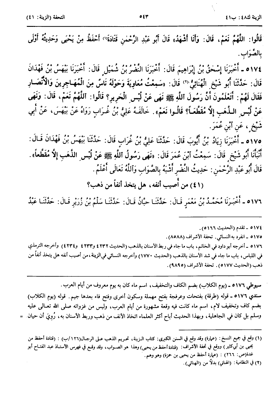 مَنْ أُصِيبَ أَنْفُهُ هَلْ يَتَّخِذُ أَنْفًا مِنْ ذَهَبٍ 5176 - أَخْبَرَنَا مُحَمَّدُ بْنُ مَعْمَرٍ قَالَ حَدَّثَنَا حَبَّانُ قَالَ حَدَّثَنَا سَلْمُ بْنُ زُرَيْرٍ قَالَ حَدَّثَنَا عَبْدُ الرَّحْمَنِ بْنُ طَرَفَةَ عَنْ جَدِّهِ عَرْفَجَةَ بْنِ أَسْعَدَ أَنَّهُ أُصِيبَ أَنْفُهُ يَوْمَ الْكُلَابِ فِي الْجَاهِلِيَّةِ فَاتَّخَذَ أَنْفًا مِنْ وَرِقٍ فَأَنْتَنَ عَلَيْهِ فَأَمَرَهُ النَّبِيُّ صَلَّى اللَّهُ عَلَيْهِ وَسَلَّمَ أَنْ يَتَّخِذَ أَنْفًا مِنْ ذَهَبٍ