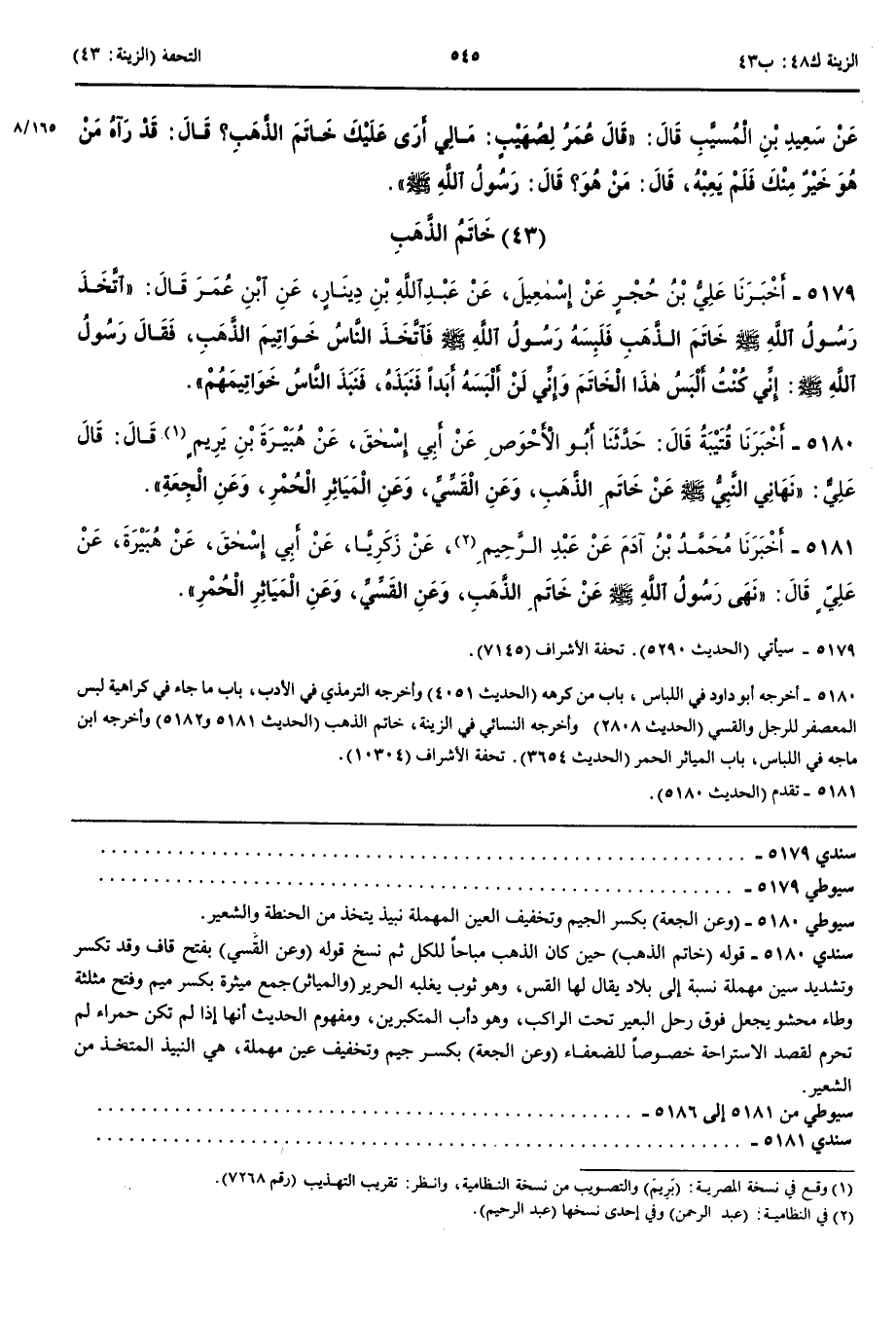 5181 - أَخْبَرَنِي مُحَمَّدُ بْنُ آدَمَ عَنْ عَبْدِ الرَّحِيمِ عَنْ زَكَرِيَّا عَنْ أَبِي إِسْحَقَ عَنْ هُبَيْرَةَ عَنْ عَلِيٍّ قَالَ نَهَى رَسُولُ اللَّهِ صَلَّى اللَّهُ عَلَيْهِ وَسَلَّمَ عَنْ خَاتَمِ الذَّهَبِ وَعَنْ الْقَسِّيِّ وَعَنْ الْمَيَاثِرِ الْحُمْرِ