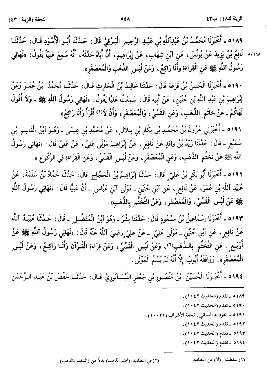 5193 - أَخْبَرَنَا إِسْمَعِيلُ بْنُ مَسْعُودٍ قَالَ حَدَّثَنَا بِشْرٌ وَهُوَ ابْنُ الْمُفَضَّلِ قَالَ حَدَّثَنَا عُبَيْدُ اللَّهِ عَنْ نَافِعٍ عَنْ ابْنِ حُنَيْنٍ مَوْلَى عَلِيٍّ عَنْ عَلِيٍّ رَضِيَ اللَّهُ عَنْهُ قَالَ نَهَانِي رَسُولُ اللَّهِ صَلَّى اللَّهُ عَلَيْهِ وَسَلَّمَ عَنْ أَرْبَعٍ عَنْ التَّخَتُّمِ بِالذَّهَبِ وَعَنْ لُبْسِ الْقَسِّيِّ وَعَنْ قِرَاءَةِ الْقُرْآنِ وَأَنَا رَاكِعٌ وَعَنْ لُبْسِ الْمُعَصْفَرِ وَوَافَقَهُ أَيُّوبُ إِلَّا أَنَّهُ لَمْ يُسَمِّ الْمَوْلَى