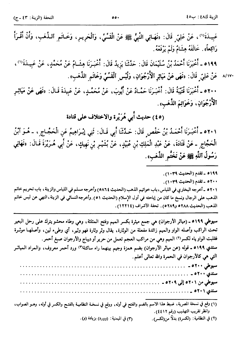 5200 - أَخْبَرَنَا قُتَيْبَةُ قَالَ أَخْبَرَنَا حَمَّادٌ عَنْ أَيُّوبَ عَنْ مُحَمَّدٍ عَنْ عَبِيدَةَ قَالَ نَهَى عَنْ مَيَاثِرِ الْأُرْجُوَانِ وَخَوَاتِيمِ الذَّهَبِ