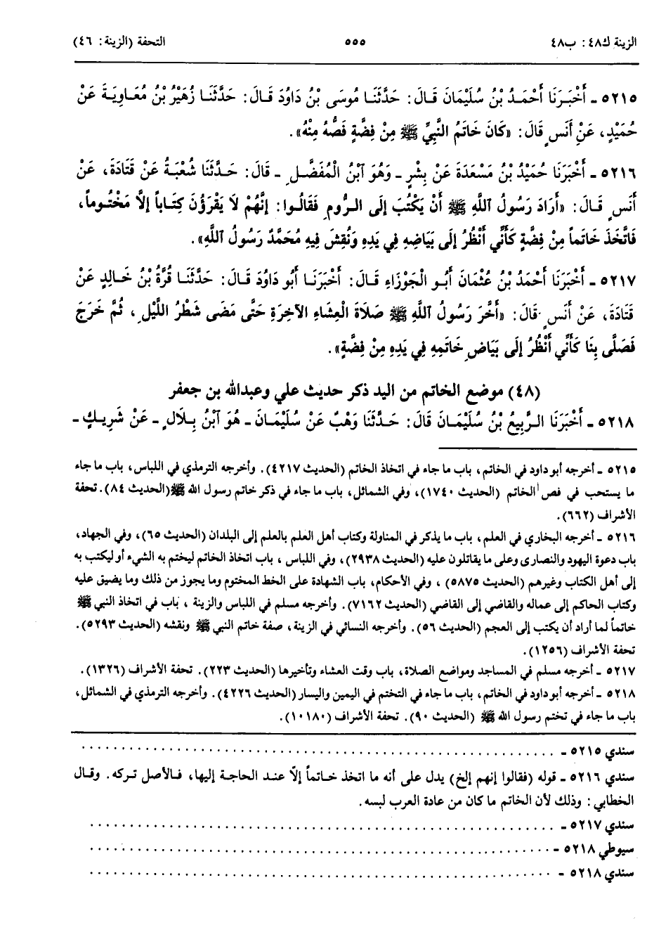 5216 - أَخْبَرَنَا حُمَيْدُ بْنُ مَسْعَدَةَ عَنْ بِشْرٍ وَهُوَ ابْنُ الْمُفَضَّلِ قَالَ حَدَّثَنَا شُعْبَةُ عَنْ قَتَادَةَ عَنْ أَنَسٍ قَالَ أَرَادَ رَسُولُ اللَّهِ صَلَّى اللَّهُ عَلَيْهِ وَسَلَّمَ أَنْ يَكْتُبَ إِلَى الرُّومِ فَقَالُوا إِنَّهُمْ لَا يَقْرَءُونَ كِتَابًا إِلَّا مَخْتُومًا فَاتَّخَذَ خَاتَمًا مِنْ فِضَّةٍ كَأَنِّي أَنْظُرُ إِلَى بَيَاضِهِ فِي يَدِهِ وَنُقِشَ فِيهِ مُحَمَّدٌ رَسُولُ اللَّهِ