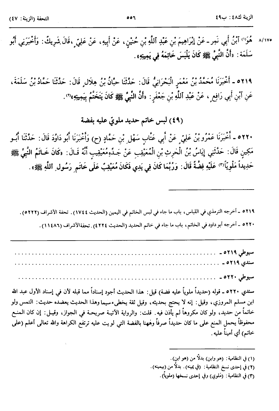 5219 - أَخْبَرَنَا مُحَمَّدُ بْنُ مَعْمَرٍ الْبَحْرَانِيُّ قَالَ حَدَّثَنَا حَبَّانُ بْنُ هِلَالٍ قَالَ حَدَّثَنَا حَمَّادُ بْنُ سَلَمَةَ عَنْ ابْنِ أَبِي رَافِعٍ عَنْ عَبْدِ اللَّهِ بْنِ جَعْفَرٍ أَنَّ النَّبِيَّ صَلَّى اللَّهُ عَلَيْهِ وَسَلَّمَ كَانَ يَتَخَتَّمُ بِيَمِينِهِ