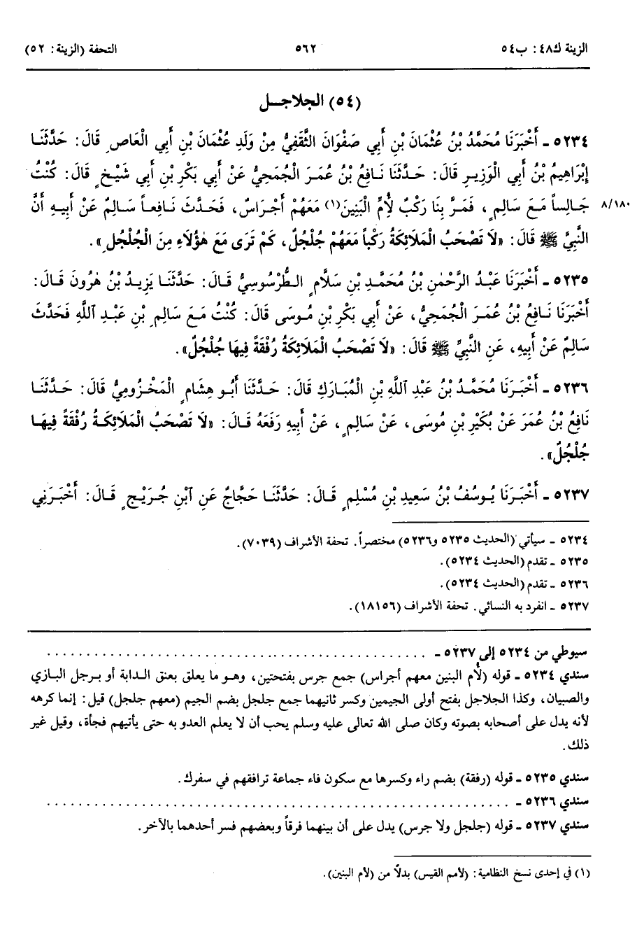 الْجَلَاجِلُ 5234 - أَخْبَرَنَا مُحَمَّدُ بْنُ عُثْمَانَ بْنِ أَبِي صَفْوَانَ الثَّقَفِيُّ مِنْ وَلَدِ عُثْمَانَ بْنِ أَبِي الْعَاصِ قَالَ حَدَّثَنَا إِبْرَاهِيمُ بْنُ أَبِي الْوَزِيرِ قَالَ حَدَّثَنَا نَافِعُ بْنُ عُمَرَ الْجُمَحِيُّ عَنْ أَبِي بَكْرِ بْنِ أَبِي شَيْخٍ قَالَ كُنْتُ جَالِسًا مَعَ سَالِمٍ فَمَرَّ بِنَا رَكْبٌ لِأُمِّ الْبَنِينَ مَعَهُمْ أَجْرَاسٌ فَحَدَّثَ نَافِعًا سَالِمٌ عَنْ أَبِيهِ أَنَّ النَّبِيَّ صَلَّى اللَّهُ عَلَيْهِ وَسَلَّمَ قَالَ لَا تَصْحَبُ الْمَلَائِكَةُ رَكْبًا مَعَهُمْ جُلْجُلٌ كَمْ تَرَى مَعَ هَؤُلَاءٍ مِنْ الْجُلْجُلِ
