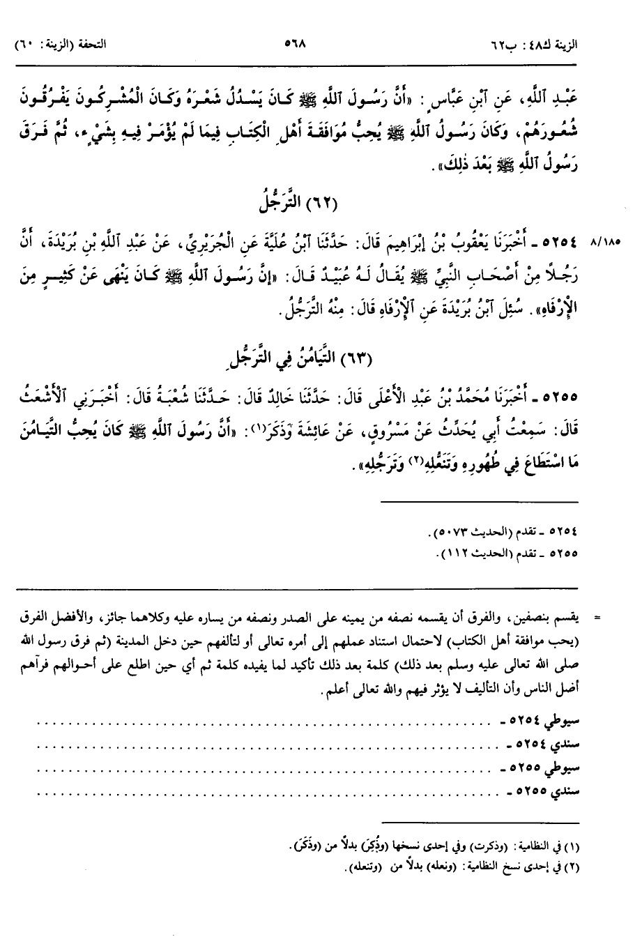 التَّرَجُّلُ 5254 - أَخْبَرَنَا يَعْقُوبُ بْنُ إِبْرَاهِيمَ قَالَ حَدَّثَنَا ابْنُ عُلَيَّةَ عَنْ الْجُرَيْرِيِّ عَنْ عَبْدِ اللَّهِ بْنُ بُرَيْدَةَ أَنَّ رَجُلًا مِنْ أَصْحَابِ النَّبِيِّ صَلَّى اللَّهُ عَلَيْهِ وَسَلَّمَ يُقَالُ لَهُ عُبَيْدٌ قَالَ إِنَّ رَسُولَ اللَّهِ صَلَّى اللَّهُ عَلَيْهِ وَسَلَّمَ كَانَ يَنْهَى عَنْ كَثِيرٍ مِنْ الْإِرْفَاهِ سُئِلَ ابْنُ بُرَيْدَةَ عَنْ الْإِرْفَاهِ قَالَ مِنْهُ التَّرَجُّلُ