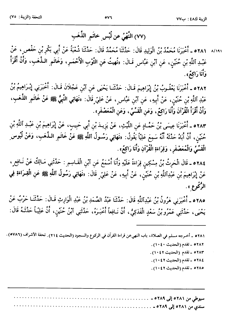 5285 - أَخْبَرَنِي هَارُونُ بْنُ عَبْدِ اللَّهِ قَالَ حَدَّثَنَا عَبْدُ الصَّمَدِ بْنُ عَبْدِ الْوَارِثِ قَالَ حَدَّثَنَا حَرْبٌ عَنْ يَحْيَى حَدَّثَنِي عَمْرُو بْنُ سَعْدٍ الْفَدَكِيُّ أَنَّ نَافِعًا أَخْبَرَهُ حَدَّثَنِي ابْنُ حُنَيْنٍ أَنَّ عَلِيًّا حَدَّثَهُ قَالَ نَهَانِي رَسُولُ اللَّهِ صَلَّى اللَّهُ عَلَيْهِ وَسَلَّمَ عَنْ ثِيَابِ الْمُعَصْفَرِ وَعَنْ خَاتَمِ الذَّهَبِ وَلُبْسِ الْقَسِّيِّ وَأَنْ أَقْرَأَ وَأَنَا رَاكِعٌ