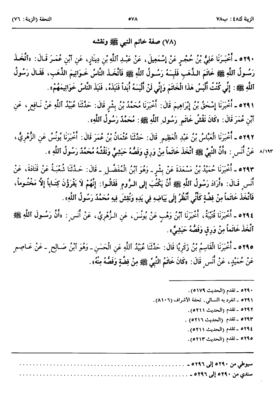 5294 - أَخْبَرَنَا قُتَيْبَةُ قَالَ حَدَّثَنَا ابْنُ وَهْبٍ عَنْ يُونُسَ عَنْ الزُّهْرِيِّ عَنْ أَنَسٍ أَنَّ رَسُولَ اللَّهِ صَلَّى اللَّهُ عَلَيْهِ وَسَلَّمَ اتَّخَذَ خَاتَمًا مِنْ وَرِقٍ وَفَصُّهُ حَبَشِيٌّ
