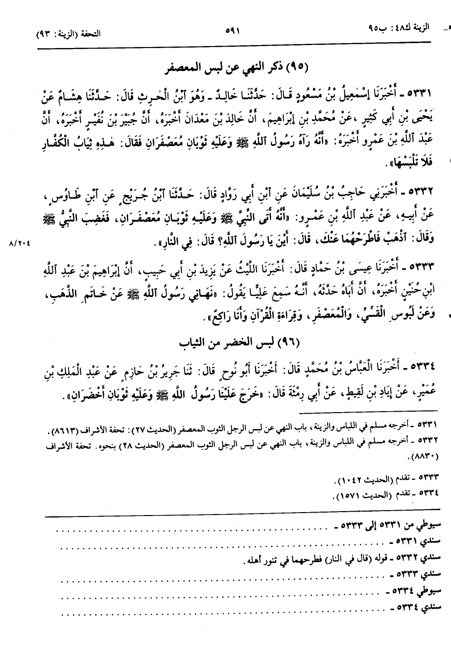 5332 - أَخْبَرَنِي حَاجِبُ بْنُ سُلَيْمَانَ عَنْ ابْنِ أَبِي رَوَّادٍ قَالَ حَدَّثَنَا ابْنُ جُرَيْجٍ عَنْ ابْنِ طَاوُسٍ عَنْ أَبِيهِ عَنْ عَبْدِ اللَّهِ بْنِ عَمْرٍو أَنَّهُ أَتَى النَّبِيَّ صَلَّى اللَّهُ عَلَيْهِ وَسَلَّمَ وَعَلَيْهِ ثَوْبَانِ مُعَصْفَرَانِ فَغَضِبَ النَّبِيُّ صَلَّى اللَّهُ عَلَيْهِ وَسَلَّمَ وَقَالَ اذْهَبْ فَاطْرَحْهُمَا عَنْكَ قَالَ أَيْنَ يَا رَسُولَ اللَّهِ قَالَ فِي النَّارِ