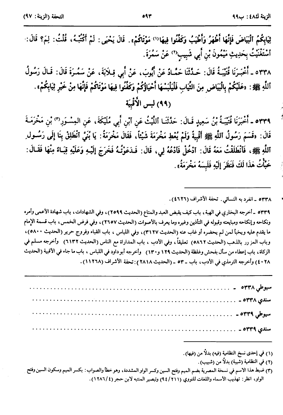 5338 - أَخْبَرَنَا قُتَيْبَةُ قَالَ حَدَّثَنَا حَمَّادٌ عَنْ أَيُّوبَ عَنْ أَبِي قِلَابَةَ عَنْ سَمُرَةَ قَالَ قَالَ رَسُولُ اللَّهِ صَلَّى اللَّهُ عَلَيْهِ وَسَلَّمَ عَلَيْكُمْ بِالْبَيَاضِ مِنْ الثِّيَابِ فَلْيَلْبَسْهَا أَحْيَاؤُكُمْ وَكَفِّنُوا فِيهَا مَوْتَاكُمْ فَإِنَّهَا مِنْ خَيْرِ ثِيَابِكُمْ