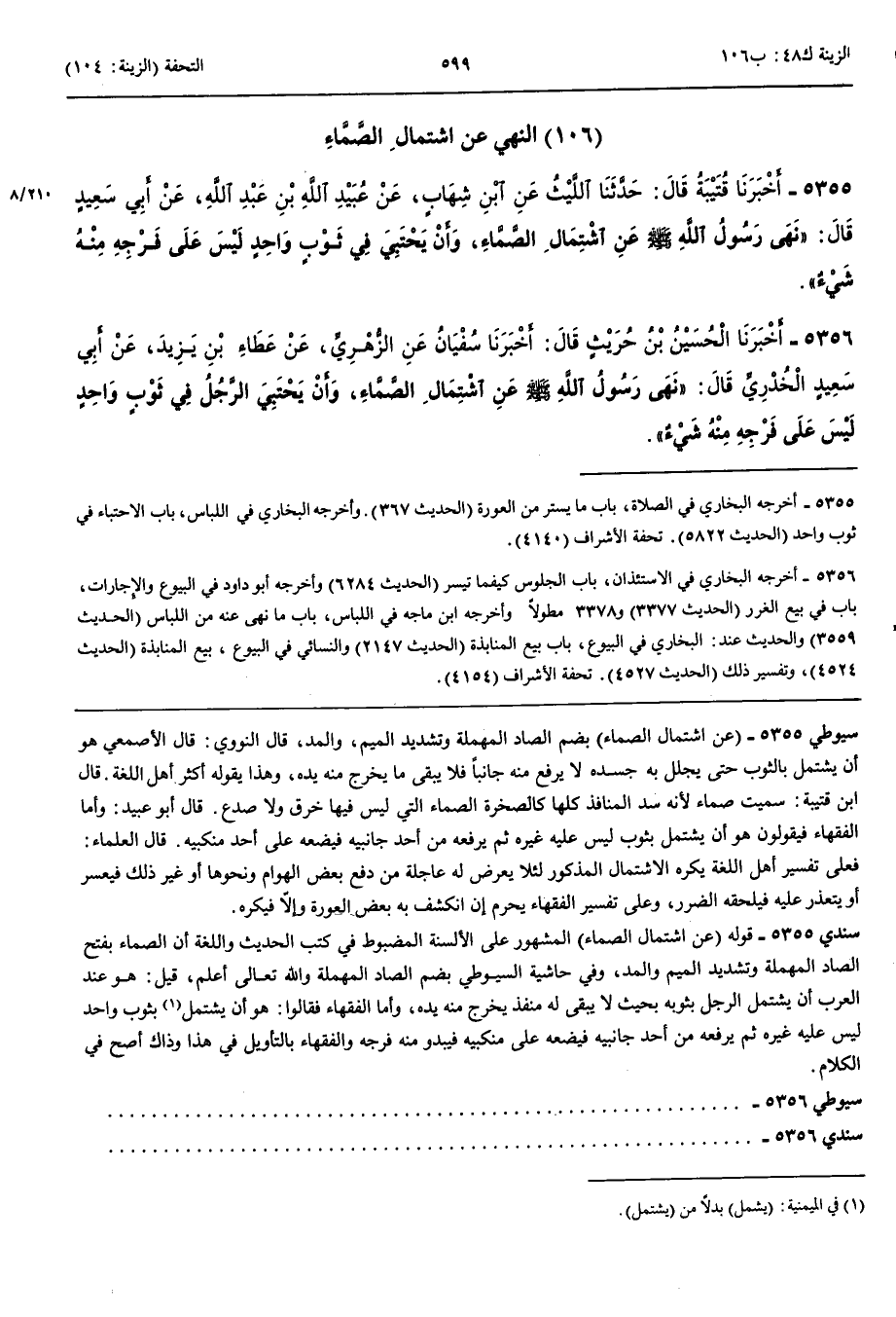 النَّهْيُ عَنْ اشْتِمَالِ الصَّمَّاءِ 5355 - أَخْبَرَنَا قُتَيْبَةُ قَالَ حَدَّثَنَا اللَّيْثُ عَنْ ابْنِ شِهَابٍ عَنْ عُبَيْدِ اللَّهِ بْنِ عَبْدِ اللَّهِ عَنْ أَبِي سَعِيدٍ قَالَ نَهَى رَسُولُ اللَّهِ صَلَّى اللَّهُ عَلَيْهِ وَسَلَّمَ عَنْ اشْتِمَالِ الصَّمَّاءِ وَأَنْ يَحْتَبِيَ فِي ثَوْبٍ وَاحِدٍ لَيْسَ عَلَى فَرْجِهِ مِنْهُ شَيْءٌ