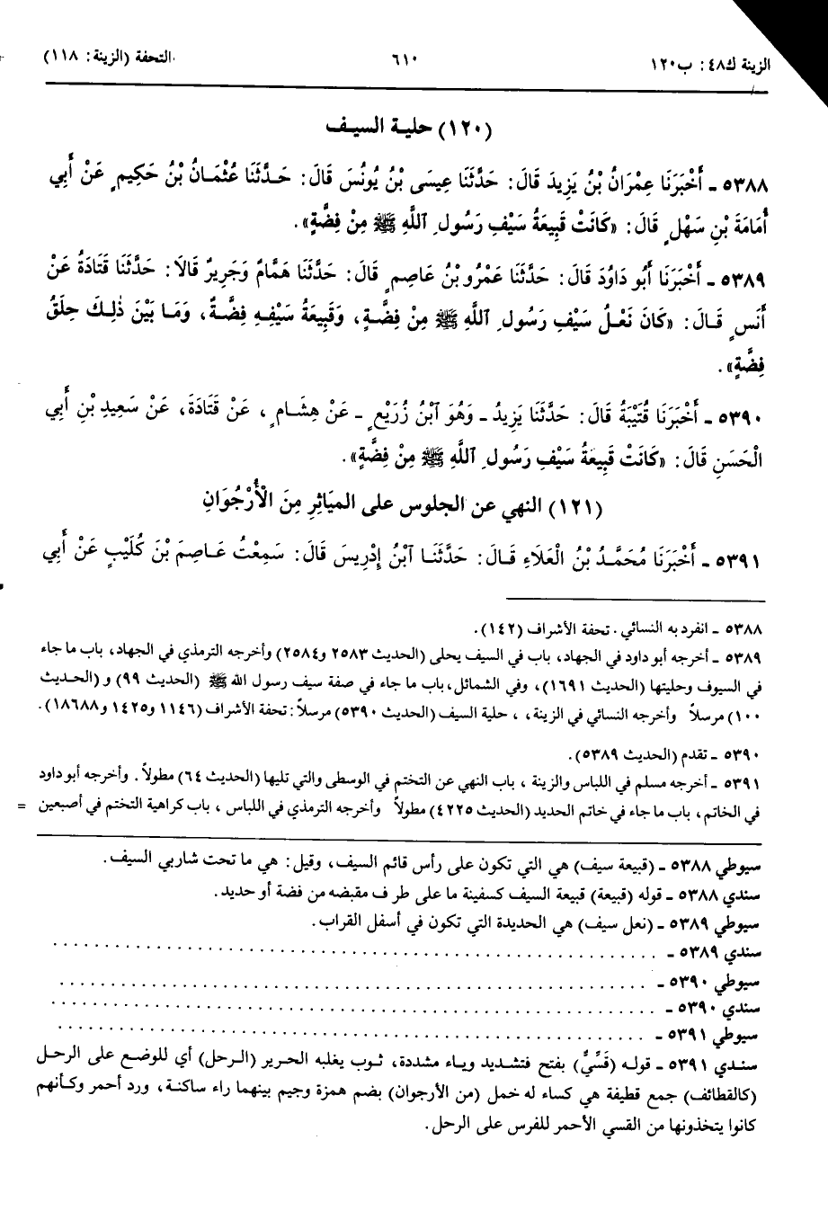 حِلْيَةُ السَّيْفِ 5388 - أَخْبَرَنَا عِمْرَانُ بْنُ يَزِيدَ قَالَ حَدَّثَنَا عِيسَى بْنُ يُونُسَ قَالَ حَدَّثَنَا عُثْمَانُ بْنُ حَكِيمٍ عَنْ أَبِي أُمَامَةَ بْنِ سَهْلٍ قَالَ كَانَتْ قَبِيعَةُ سَيْفِ رَسُولِ اللَّهِ صَلَّى اللَّهُ عَلَيْهِ وَسَلَّمَ مِنْ فِضَّةٍ